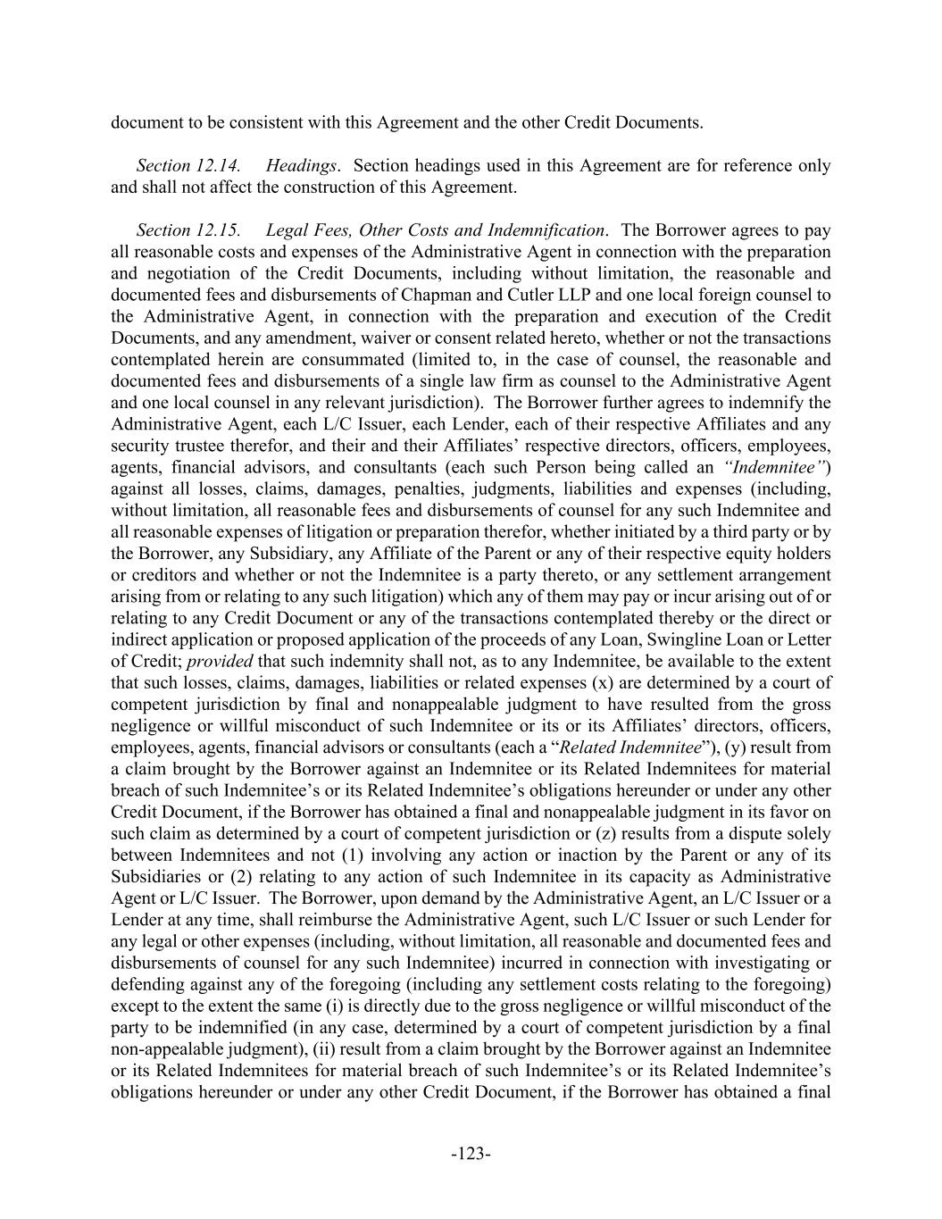 -123- document to be consistent with this Agreement and the other Credit Documents. Section 12.14. Headings. Section headings used in this Agreement are for reference only and shall not affect the construction of this Agreement. Section 12.15. Legal Fees, Other Costs and Indemnification. The Borrower agrees to pay all reasonable costs and expenses of the Administrative Agent in connection with the preparation and negotiation of the Credit Documents, including without limitation, the reasonable and documented fees and disbursements of Chapman and Cutler LLP and one local foreign counsel to the Administrative Agent, in connection with the preparation and execution of the Credit Documents, and any amendment, waiver or consent related hereto, whether or not the transactions contemplated herein are consummated (limited to, in the case of counsel, the reasonable and documented fees and disbursements of a single law firm as counsel to the Administrative Agent and one local counsel in any relevant jurisdiction). The Borrower further agrees to indemnify the Administrative Agent, each L/C Issuer, each Lender, each of their respective Affiliates and any security trustee therefor, and their and their Affiliates’ respective directors, officers, employees, agents, financial advisors, and consultants (each such Person being called an “Indemnitee”) against all losses, claims, damages, penalties, judgments, liabilities and expenses (including, without limitation, all reasonable fees and disbursements of counsel for any such Indemnitee and all reasonable expenses of litigation or preparation therefor, whether initiated by a third party or by the Borrower, any Subsidiary, any Affiliate of the Parent or any of their respective equity holders or creditors and whether or not the Indemnitee is a party thereto, or any settlement arrangement arising from or relating to any such litigation) which any of them may pay or incur arising out of or relating to any Credit Document or any of the transactions contemplated thereby or the direct or indirect application or proposed application of the proceeds of any Loan, Swingline Loan or Letter of Credit; provided that such indemnity shall not, as to any Indemnitee, be available to the extent that such losses, claims, damages, liabilities or related expenses (x) are determined by a court of competent jurisdiction by final and nonappealable judgment to have resulted from the gross negligence or willful misconduct of such Indemnitee or its or its Affiliates’ directors, officers, employees, agents, financial advisors or consultants (each a “Related Indemnitee”), (y) result from a claim brought by the Borrower against an Indemnitee or its Related Indemnitees for material breach of such Indemnitee’s or its Related Indemnitee’s obligations hereunder or under any other Credit Document, if the Borrower has obtained a final and nonappealable judgment in its favor on such claim as determined by a court of competent jurisdiction or (z) results from a dispute solely between Indemnitees and not (1) involving any action or inaction by the Parent or any of its Subsidiaries or (2) relating to any action of such Indemnitee in its capacity as Administrative Agent or L/C Issuer. The Borrower, upon demand by the Administrative Agent, an L/C Issuer or a Lender at any time, shall reimburse the Administrative Agent, such L/C Issuer or such Lender for any legal or other expenses (including, without limitation, all reasonable and documented fees and disbursements of counsel for any such Indemnitee) incurred in connection with investigating or defending against any of the foregoing (including any settlement costs relating to the foregoing) except to the extent the same (i) is directly due to the gross negligence or willful misconduct of the party to be indemnified (in any case, determined by a court of competent jurisdiction by a final non-appealable judgment), (ii) result from a claim brought by the Borrower against an Indemnitee or its Related Indemnitees for material breach of such Indemnitee’s or its Related Indemnitee’s obligations hereunder or under any other Credit Document, if the Borrower has obtained a final
