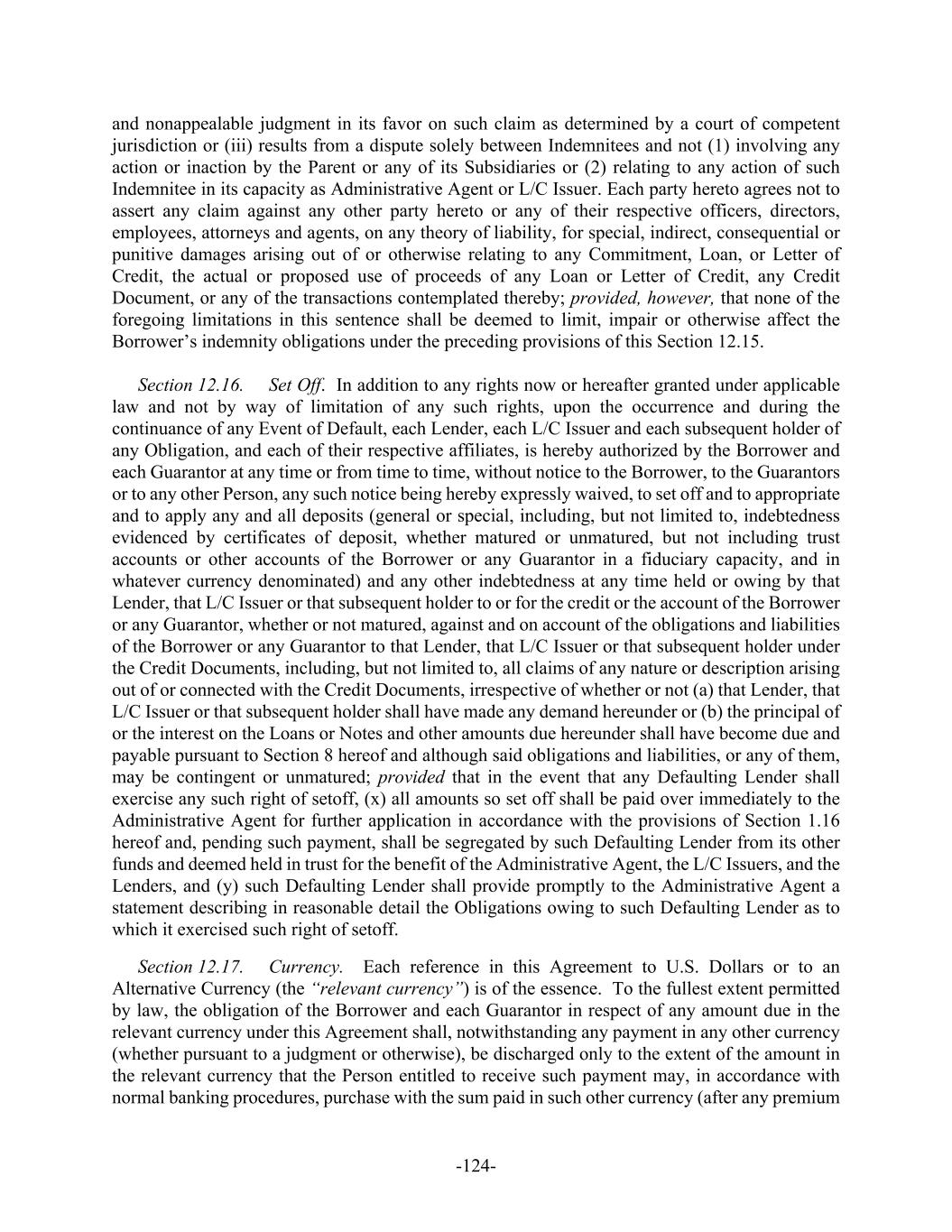 -124- and nonappealable judgment in its favor on such claim as determined by a court of competent jurisdiction or (iii) results from a dispute solely between Indemnitees and not (1) involving any action or inaction by the Parent or any of its Subsidiaries or (2) relating to any action of such Indemnitee in its capacity as Administrative Agent or L/C Issuer. Each party hereto agrees not to assert any claim against any other party hereto or any of their respective officers, directors, employees, attorneys and agents, on any theory of liability, for special, indirect, consequential or punitive damages arising out of or otherwise relating to any Commitment, Loan, or Letter of Credit, the actual or proposed use of proceeds of any Loan or Letter of Credit, any Credit Document, or any of the transactions contemplated thereby; provided, however, that none of the foregoing limitations in this sentence shall be deemed to limit, impair or otherwise affect the Borrower’s indemnity obligations under the preceding provisions of this Section 12.15. Section 12.16. Set Off. In addition to any rights now or hereafter granted under applicable law and not by way of limitation of any such rights, upon the occurrence and during the continuance of any Event of Default, each Lender, each L/C Issuer and each subsequent holder of any Obligation, and each of their respective affiliates, is hereby authorized by the Borrower and each Guarantor at any time or from time to time, without notice to the Borrower, to the Guarantors or to any other Person, any such notice being hereby expressly waived, to set off and to appropriate and to apply any and all deposits (general or special, including, but not limited to, indebtedness evidenced by certificates of deposit, whether matured or unmatured, but not including trust accounts or other accounts of the Borrower or any Guarantor in a fiduciary capacity, and in whatever currency denominated) and any other indebtedness at any time held or owing by that Lender, that L/C Issuer or that subsequent holder to or for the credit or the account of the Borrower or any Guarantor, whether or not matured, against and on account of the obligations and liabilities of the Borrower or any Guarantor to that Lender, that L/C Issuer or that subsequent holder under the Credit Documents, including, but not limited to, all claims of any nature or description arising out of or connected with the Credit Documents, irrespective of whether or not (a) that Lender, that L/C Issuer or that subsequent holder shall have made any demand hereunder or (b) the principal of or the interest on the Loans or Notes and other amounts due hereunder shall have become due and payable pursuant to Section 8 hereof and although said obligations and liabilities, or any of them, may be contingent or unmatured; provided that in the event that any Defaulting Lender shall exercise any such right of setoff, (x) all amounts so set off shall be paid over immediately to the Administrative Agent for further application in accordance with the provisions of Section 1.16 hereof and, pending such payment, shall be segregated by such Defaulting Lender from its other funds and deemed held in trust for the benefit of the Administrative Agent, the L/C Issuers, and the Lenders, and (y) such Defaulting Lender shall provide promptly to the Administrative Agent a statement describing in reasonable detail the Obligations owing to such Defaulting Lender as to which it exercised such right of setoff. Section 12.17. Currency. Each reference in this Agreement to U.S. Dollars or to an Alternative Currency (the “relevant currency”) is of the essence. To the fullest extent permitted by law, the obligation of the Borrower and each Guarantor in respect of any amount due in the relevant currency under this Agreement shall, notwithstanding any payment in any other currency (whether pursuant to a judgment or otherwise), be discharged only to the extent of the amount in the relevant currency that the Person entitled to receive such payment may, in accordance with normal banking procedures, purchase with the sum paid in such other currency (after any premium