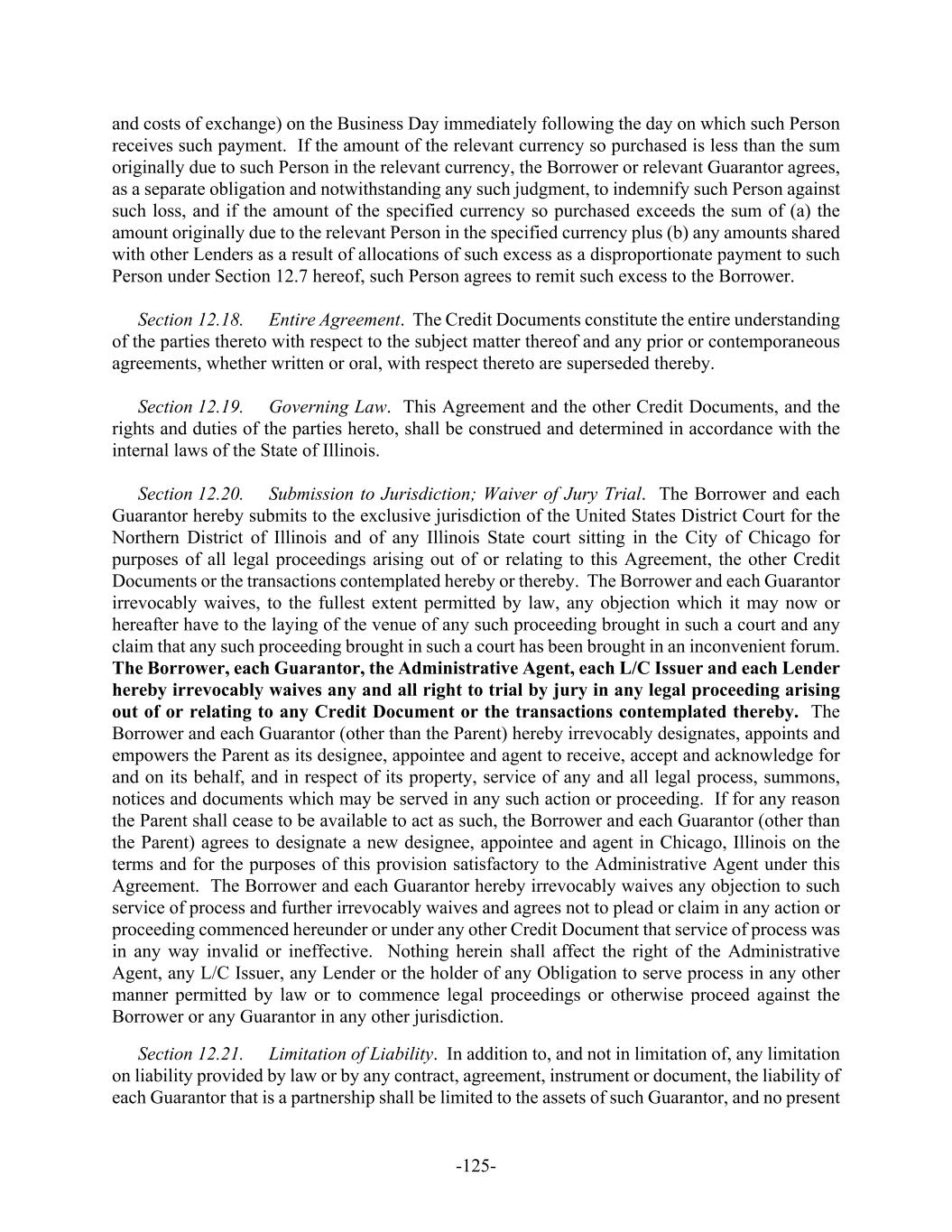 -125- and costs of exchange) on the Business Day immediately following the day on which such Person receives such payment. If the amount of the relevant currency so purchased is less than the sum originally due to such Person in the relevant currency, the Borrower or relevant Guarantor agrees, as a separate obligation and notwithstanding any such judgment, to indemnify such Person against such loss, and if the amount of the specified currency so purchased exceeds the sum of (a) the amount originally due to the relevant Person in the specified currency plus (b) any amounts shared with other Lenders as a result of allocations of such excess as a disproportionate payment to such Person under Section 12.7 hereof, such Person agrees to remit such excess to the Borrower. Section 12.18. Entire Agreement. The Credit Documents constitute the entire understanding of the parties thereto with respect to the subject matter thereof and any prior or contemporaneous agreements, whether written or oral, with respect thereto are superseded thereby. Section 12.19. Governing Law. This Agreement and the other Credit Documents, and the rights and duties of the parties hereto, shall be construed and determined in accordance with the internal laws of the State of Illinois. Section 12.20. Submission to Jurisdiction; Waiver of Jury Trial. The Borrower and each Guarantor hereby submits to the exclusive jurisdiction of the United States District Court for the Northern District of Illinois and of any Illinois State court sitting in the City of Chicago for purposes of all legal proceedings arising out of or relating to this Agreement, the other Credit Documents or the transactions contemplated hereby or thereby. The Borrower and each Guarantor irrevocably waives, to the fullest extent permitted by law, any objection which it may now or hereafter have to the laying of the venue of any such proceeding brought in such a court and any claim that any such proceeding brought in such a court has been brought in an inconvenient forum. The Borrower, each Guarantor, the Administrative Agent, each L/C Issuer and each Lender hereby irrevocably waives any and all right to trial by jury in any legal proceeding arising out of or relating to any Credit Document or the transactions contemplated thereby. The Borrower and each Guarantor (other than the Parent) hereby irrevocably designates, appoints and empowers the Parent as its designee, appointee and agent to receive, accept and acknowledge for and on its behalf, and in respect of its property, service of any and all legal process, summons, notices and documents which may be served in any such action or proceeding. If for any reason the Parent shall cease to be available to act as such, the Borrower and each Guarantor (other than the Parent) agrees to designate a new designee, appointee and agent in Chicago, Illinois on the terms and for the purposes of this provision satisfactory to the Administrative Agent under this Agreement. The Borrower and each Guarantor hereby irrevocably waives any objection to such service of process and further irrevocably waives and agrees not to plead or claim in any action or proceeding commenced hereunder or under any other Credit Document that service of process was in any way invalid or ineffective. Nothing herein shall affect the right of the Administrative Agent, any L/C Issuer, any Lender or the holder of any Obligation to serve process in any other manner permitted by law or to commence legal proceedings or otherwise proceed against the Borrower or any Guarantor in any other jurisdiction. Section 12.21. Limitation of Liability. In addition to, and not in limitation of, any limitation on liability provided by law or by any contract, agreement, instrument or document, the liability of each Guarantor that is a partnership shall be limited to the assets of such Guarantor, and no present