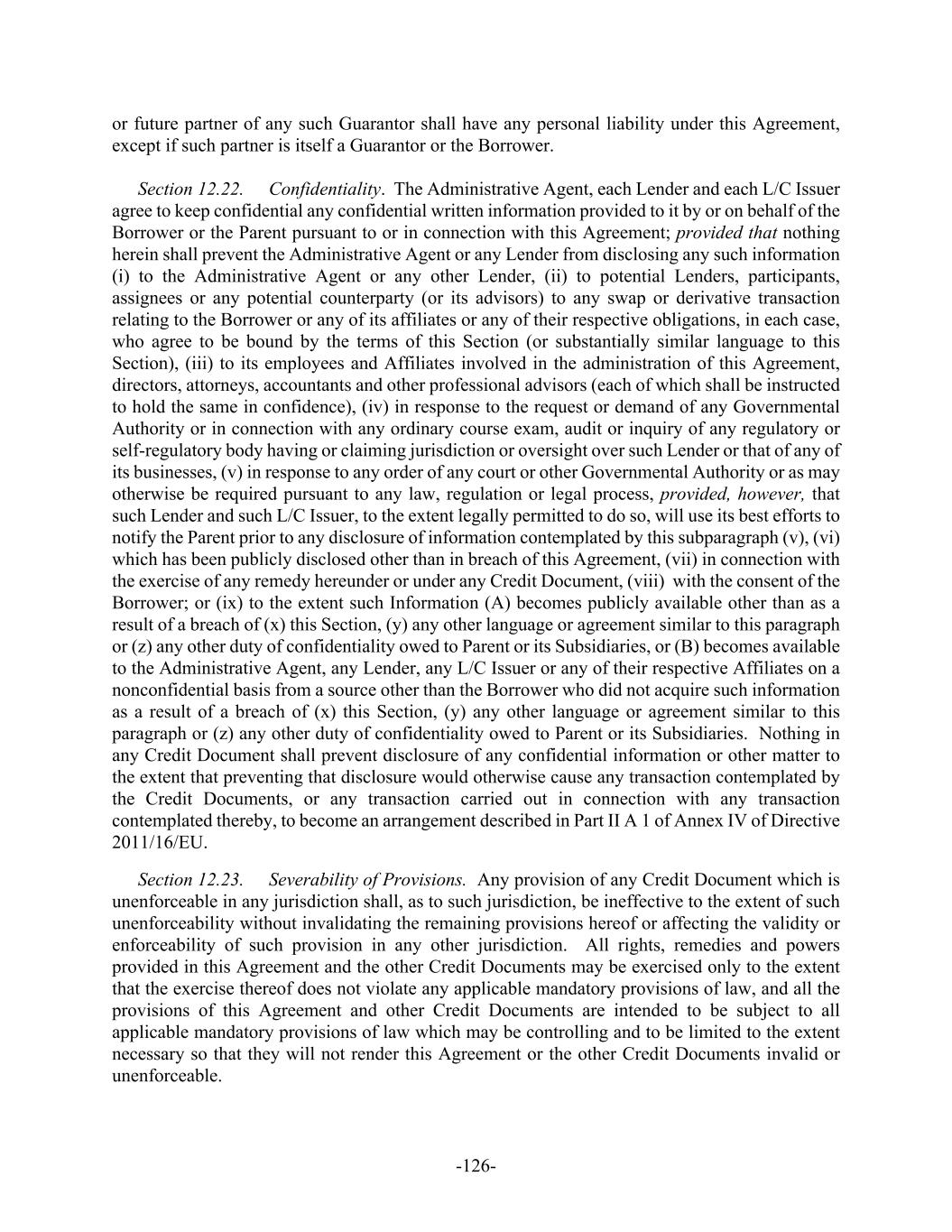 -126- or future partner of any such Guarantor shall have any personal liability under this Agreement, except if such partner is itself a Guarantor or the Borrower. Section 12.22. Confidentiality. The Administrative Agent, each Lender and each L/C Issuer agree to keep confidential any confidential written information provided to it by or on behalf of the Borrower or the Parent pursuant to or in connection with this Agreement; provided that nothing herein shall prevent the Administrative Agent or any Lender from disclosing any such information (i) to the Administrative Agent or any other Lender, (ii) to potential Lenders, participants, assignees or any potential counterparty (or its advisors) to any swap or derivative transaction relating to the Borrower or any of its affiliates or any of their respective obligations, in each case, who agree to be bound by the terms of this Section (or substantially similar language to this Section), (iii) to its employees and Affiliates involved in the administration of this Agreement, directors, attorneys, accountants and other professional advisors (each of which shall be instructed to hold the same in confidence), (iv) in response to the request or demand of any Governmental Authority or in connection with any ordinary course exam, audit or inquiry of any regulatory or self-regulatory body having or claiming jurisdiction or oversight over such Lender or that of any of its businesses, (v) in response to any order of any court or other Governmental Authority or as may otherwise be required pursuant to any law, regulation or legal process, provided, however, that such Lender and such L/C Issuer, to the extent legally permitted to do so, will use its best efforts to notify the Parent prior to any disclosure of information contemplated by this subparagraph (v), (vi) which has been publicly disclosed other than in breach of this Agreement, (vii) in connection with the exercise of any remedy hereunder or under any Credit Document, (viii) with the consent of the Borrower; or (ix) to the extent such Information (A) becomes publicly available other than as a result of a breach of (x) this Section, (y) any other language or agreement similar to this paragraph or (z) any other duty of confidentiality owed to Parent or its Subsidiaries, or (B) becomes available to the Administrative Agent, any Lender, any L/C Issuer or any of their respective Affiliates on a nonconfidential basis from a source other than the Borrower who did not acquire such information as a result of a breach of (x) this Section, (y) any other language or agreement similar to this paragraph or (z) any other duty of confidentiality owed to Parent or its Subsidiaries. Nothing in any Credit Document shall prevent disclosure of any confidential information or other matter to the extent that preventing that disclosure would otherwise cause any transaction contemplated by the Credit Documents, or any transaction carried out in connection with any transaction contemplated thereby, to become an arrangement described in Part II A 1 of Annex IV of Directive 2011/16/EU. Section 12.23. Severability of Provisions. Any provision of any Credit Document which is unenforceable in any jurisdiction shall, as to such jurisdiction, be ineffective to the extent of such unenforceability without invalidating the remaining provisions hereof or affecting the validity or enforceability of such provision in any other jurisdiction. All rights, remedies and powers provided in this Agreement and the other Credit Documents may be exercised only to the extent that the exercise thereof does not violate any applicable mandatory provisions of law, and all the provisions of this Agreement and other Credit Documents are intended to be subject to all applicable mandatory provisions of law which may be controlling and to be limited to the extent necessary so that they will not render this Agreement or the other Credit Documents invalid or unenforceable.