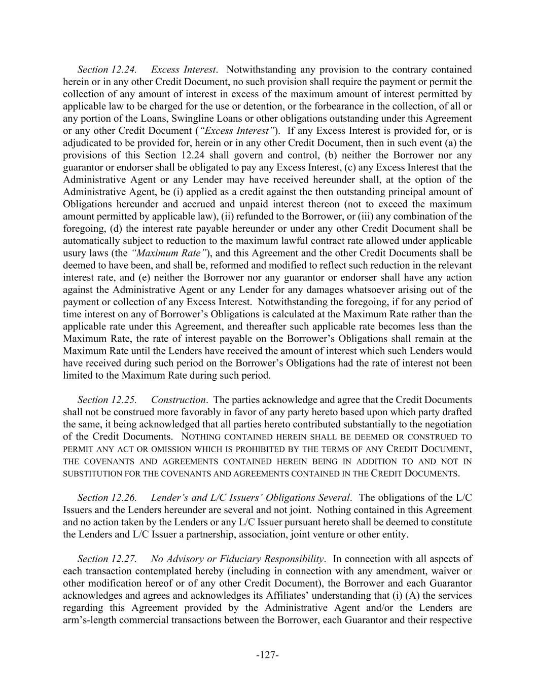 -127- Section 12.24. Excess Interest. Notwithstanding any provision to the contrary contained herein or in any other Credit Document, no such provision shall require the payment or permit the collection of any amount of interest in excess of the maximum amount of interest permitted by applicable law to be charged for the use or detention, or the forbearance in the collection, of all or any portion of the Loans, Swingline Loans or other obligations outstanding under this Agreement or any other Credit Document (“Excess Interest”). If any Excess Interest is provided for, or is adjudicated to be provided for, herein or in any other Credit Document, then in such event (a) the provisions of this Section 12.24 shall govern and control, (b) neither the Borrower nor any guarantor or endorser shall be obligated to pay any Excess Interest, (c) any Excess Interest that the Administrative Agent or any Lender may have received hereunder shall, at the option of the Administrative Agent, be (i) applied as a credit against the then outstanding principal amount of Obligations hereunder and accrued and unpaid interest thereon (not to exceed the maximum amount permitted by applicable law), (ii) refunded to the Borrower, or (iii) any combination of the foregoing, (d) the interest rate payable hereunder or under any other Credit Document shall be automatically subject to reduction to the maximum lawful contract rate allowed under applicable usury laws (the “Maximum Rate”), and this Agreement and the other Credit Documents shall be deemed to have been, and shall be, reformed and modified to reflect such reduction in the relevant interest rate, and (e) neither the Borrower nor any guarantor or endorser shall have any action against the Administrative Agent or any Lender for any damages whatsoever arising out of the payment or collection of any Excess Interest. Notwithstanding the foregoing, if for any period of time interest on any of Borrower’s Obligations is calculated at the Maximum Rate rather than the applicable rate under this Agreement, and thereafter such applicable rate becomes less than the Maximum Rate, the rate of interest payable on the Borrower’s Obligations shall remain at the Maximum Rate until the Lenders have received the amount of interest which such Lenders would have received during such period on the Borrower’s Obligations had the rate of interest not been limited to the Maximum Rate during such period. Section 12.25. Construction. The parties acknowledge and agree that the Credit Documents shall not be construed more favorably in favor of any party hereto based upon which party drafted the same, it being acknowledged that all parties hereto contributed substantially to the negotiation of the Credit Documents. NOTHING CONTAINED HEREIN SHALL BE DEEMED OR CONSTRUED TO PERMIT ANY ACT OR OMISSION WHICH IS PROHIBITED BY THE TERMS OF ANY CREDIT DOCUMENT, THE COVENANTS AND AGREEMENTS CONTAINED HEREIN BEING IN ADDITION TO AND NOT IN SUBSTITUTION FOR THE COVENANTS AND AGREEMENTS CONTAINED IN THE CREDIT DOCUMENTS. Section 12.26. Lender’s and L/C Issuers’ Obligations Several. The obligations of the L/C Issuers and the Lenders hereunder are several and not joint. Nothing contained in this Agreement and no action taken by the Lenders or any L/C Issuer pursuant hereto shall be deemed to constitute the Lenders and L/C Issuer a partnership, association, joint venture or other entity. Section 12.27. No Advisory or Fiduciary Responsibility. In connection with all aspects of each transaction contemplated hereby (including in connection with any amendment, waiver or other modification hereof or of any other Credit Document), the Borrower and each Guarantor acknowledges and agrees and acknowledges its Affiliates’ understanding that (i) (A) the services regarding this Agreement provided by the Administrative Agent and/or the Lenders are arm’s-length commercial transactions between the Borrower, each Guarantor and their respective