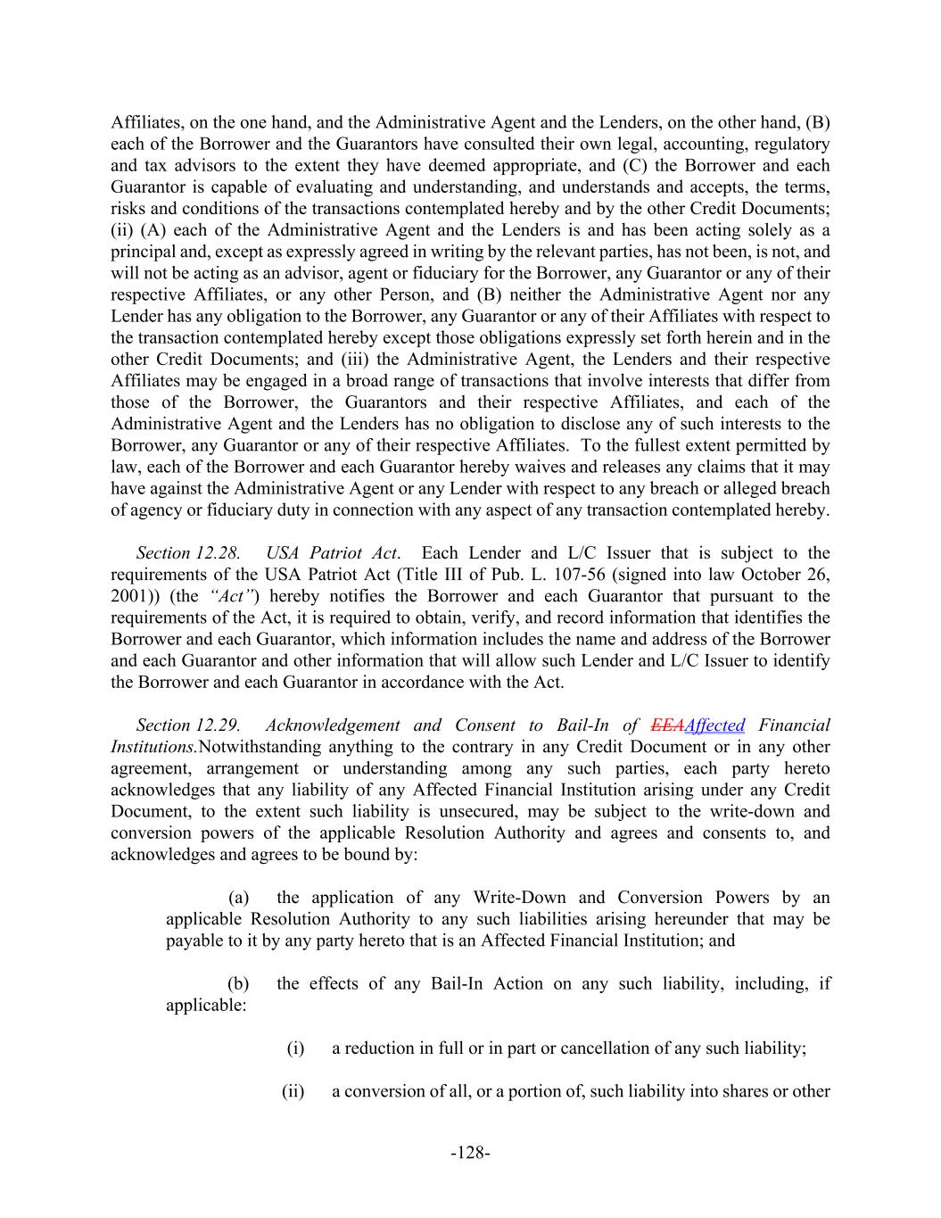 -128- Affiliates, on the one hand, and the Administrative Agent and the Lenders, on the other hand, (B) each of the Borrower and the Guarantors have consulted their own legal, accounting, regulatory and tax advisors to the extent they have deemed appropriate, and (C) the Borrower and each Guarantor is capable of evaluating and understanding, and understands and accepts, the terms, risks and conditions of the transactions contemplated hereby and by the other Credit Documents; (ii) (A) each of the Administrative Agent and the Lenders is and has been acting solely as a principal and, except as expressly agreed in writing by the relevant parties, has not been, is not, and will not be acting as an advisor, agent or fiduciary for the Borrower, any Guarantor or any of their respective Affiliates, or any other Person, and (B) neither the Administrative Agent nor any Lender has any obligation to the Borrower, any Guarantor or any of their Affiliates with respect to the transaction contemplated hereby except those obligations expressly set forth herein and in the other Credit Documents; and (iii) the Administrative Agent, the Lenders and their respective Affiliates may be engaged in a broad range of transactions that involve interests that differ from those of the Borrower, the Guarantors and their respective Affiliates, and each of the Administrative Agent and the Lenders has no obligation to disclose any of such interests to the Borrower, any Guarantor or any of their respective Affiliates. To the fullest extent permitted by law, each of the Borrower and each Guarantor hereby waives and releases any claims that it may have against the Administrative Agent or any Lender with respect to any breach or alleged breach of agency or fiduciary duty in connection with any aspect of any transaction contemplated hereby. Section 12.28. USA Patriot Act. Each Lender and L/C Issuer that is subject to the requirements of the USA Patriot Act (Title III of Pub. L. 107-56 (signed into law October 26, 2001)) (the “Act”) hereby notifies the Borrower and each Guarantor that pursuant to the requirements of the Act, it is required to obtain, verify, and record information that identifies the Borrower and each Guarantor, which information includes the name and address of the Borrower and each Guarantor and other information that will allow such Lender and L/C Issuer to identify the Borrower and each Guarantor in accordance with the Act. Section 12.29. Acknowledgement and Consent to Bail-In of EEAAffected Financial Institutions.Notwithstanding anything to the contrary in any Credit Document or in any other agreement, arrangement or understanding among any such parties, each party hereto acknowledges that any liability of any Affected Financial Institution arising under any Credit Document, to the extent such liability is unsecured, may be subject to the write-down and conversion powers of the applicable Resolution Authority and agrees and consents to, and acknowledges and agrees to be bound by: (a) the application of any Write-Down and Conversion Powers by an applicable Resolution Authority to any such liabilities arising hereunder that may be payable to it by any party hereto that is an Affected Financial Institution; and (b) the effects of any Bail-In Action on any such liability, including, if applicable: (i) a reduction in full or in part or cancellation of any such liability; (ii) a conversion of all, or a portion of, such liability into shares or other