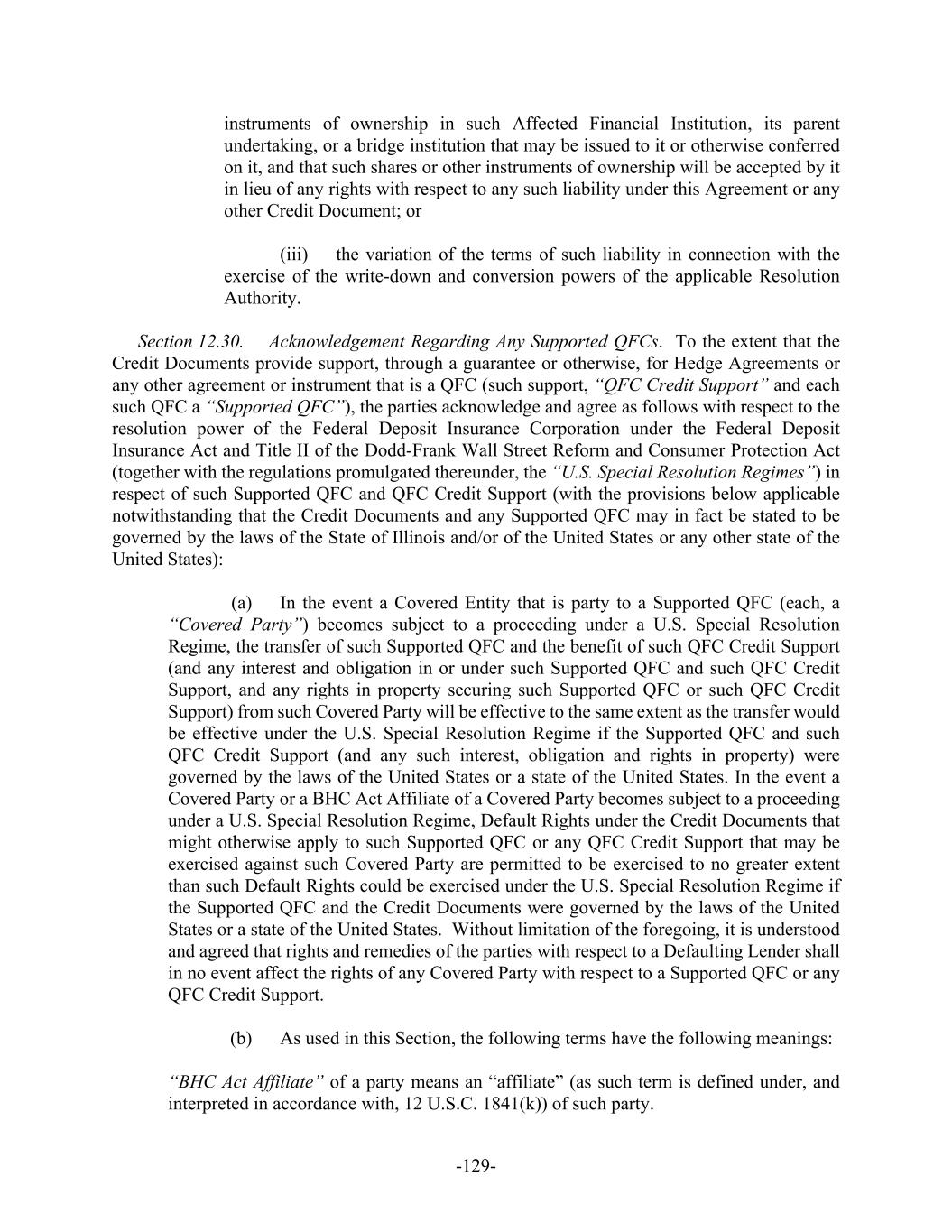 -129- instruments of ownership in such Affected Financial Institution, its parent undertaking, or a bridge institution that may be issued to it or otherwise conferred on it, and that such shares or other instruments of ownership will be accepted by it in lieu of any rights with respect to any such liability under this Agreement or any other Credit Document; or (iii) the variation of the terms of such liability in connection with the exercise of the write-down and conversion powers of the applicable Resolution Authority. Section 12.30. Acknowledgement Regarding Any Supported QFCs. To the extent that the Credit Documents provide support, through a guarantee or otherwise, for Hedge Agreements or any other agreement or instrument that is a QFC (such support, “QFC Credit Support” and each such QFC a “Supported QFC”), the parties acknowledge and agree as follows with respect to the resolution power of the Federal Deposit Insurance Corporation under the Federal Deposit Insurance Act and Title II of the Dodd-Frank Wall Street Reform and Consumer Protection Act (together with the regulations promulgated thereunder, the “U.S. Special Resolution Regimes”) in respect of such Supported QFC and QFC Credit Support (with the provisions below applicable notwithstanding that the Credit Documents and any Supported QFC may in fact be stated to be governed by the laws of the State of Illinois and/or of the United States or any other state of the United States): (a) In the event a Covered Entity that is party to a Supported QFC (each, a “Covered Party”) becomes subject to a proceeding under a U.S. Special Resolution Regime, the transfer of such Supported QFC and the benefit of such QFC Credit Support (and any interest and obligation in or under such Supported QFC and such QFC Credit Support, and any rights in property securing such Supported QFC or such QFC Credit Support) from such Covered Party will be effective to the same extent as the transfer would be effective under the U.S. Special Resolution Regime if the Supported QFC and such QFC Credit Support (and any such interest, obligation and rights in property) were governed by the laws of the United States or a state of the United States. In the event a Covered Party or a BHC Act Affiliate of a Covered Party becomes subject to a proceeding under a U.S. Special Resolution Regime, Default Rights under the Credit Documents that might otherwise apply to such Supported QFC or any QFC Credit Support that may be exercised against such Covered Party are permitted to be exercised to no greater extent than such Default Rights could be exercised under the U.S. Special Resolution Regime if the Supported QFC and the Credit Documents were governed by the laws of the United States or a state of the United States. Without limitation of the foregoing, it is understood and agreed that rights and remedies of the parties with respect to a Defaulting Lender shall in no event affect the rights of any Covered Party with respect to a Supported QFC or any QFC Credit Support. (b) As used in this Section, the following terms have the following meanings: “BHC Act Affiliate” of a party means an “affiliate” (as such term is defined under, and interpreted in accordance with, 12 U.S.C. 1841(k)) of such party.
