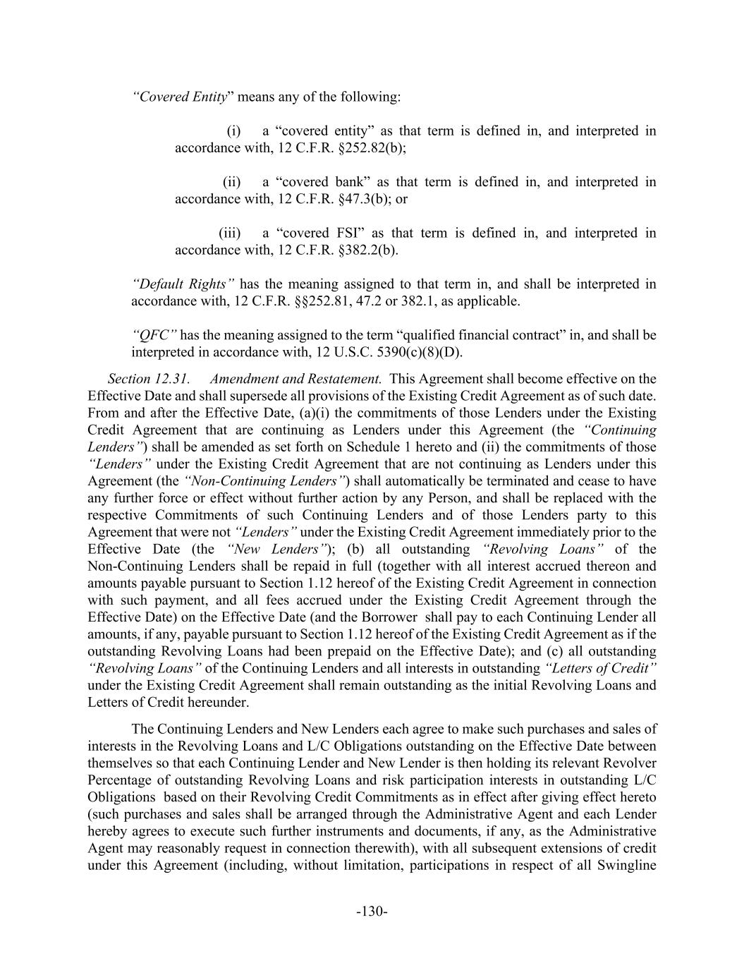 -130- “Covered Entity” means any of the following: (i) a “covered entity” as that term is defined in, and interpreted in accordance with, 12 C.F.R. §252.82(b); (ii) a “covered bank” as that term is defined in, and interpreted in accordance with, 12 C.F.R. §47.3(b); or (iii) a “covered FSI” as that term is defined in, and interpreted in accordance with, 12 C.F.R. §382.2(b). “Default Rights” has the meaning assigned to that term in, and shall be interpreted in accordance with, 12 C.F.R. §§252.81, 47.2 or 382.1, as applicable. “QFC” has the meaning assigned to the term “qualified financial contract” in, and shall be interpreted in accordance with, 12 U.S.C. 5390(c)(8)(D). Section 12.31. Amendment and Restatement. This Agreement shall become effective on the Effective Date and shall supersede all provisions of the Existing Credit Agreement as of such date. From and after the Effective Date, (a)(i) the commitments of those Lenders under the Existing Credit Agreement that are continuing as Lenders under this Agreement (the “Continuing Lenders”) shall be amended as set forth on Schedule 1 hereto and (ii) the commitments of those “Lenders” under the Existing Credit Agreement that are not continuing as Lenders under this Agreement (the “Non-Continuing Lenders”) shall automatically be terminated and cease to have any further force or effect without further action by any Person, and shall be replaced with the respective Commitments of such Continuing Lenders and of those Lenders party to this Agreement that were not “Lenders” under the Existing Credit Agreement immediately prior to the Effective Date (the “New Lenders”); (b) all outstanding “Revolving Loans” of the Non-Continuing Lenders shall be repaid in full (together with all interest accrued thereon and amounts payable pursuant to Section 1.12 hereof of the Existing Credit Agreement in connection with such payment, and all fees accrued under the Existing Credit Agreement through the Effective Date) on the Effective Date (and the Borrower shall pay to each Continuing Lender all amounts, if any, payable pursuant to Section 1.12 hereof of the Existing Credit Agreement as if the outstanding Revolving Loans had been prepaid on the Effective Date); and (c) all outstanding “Revolving Loans” of the Continuing Lenders and all interests in outstanding “Letters of Credit” under the Existing Credit Agreement shall remain outstanding as the initial Revolving Loans and Letters of Credit hereunder. The Continuing Lenders and New Lenders each agree to make such purchases and sales of interests in the Revolving Loans and L/C Obligations outstanding on the Effective Date between themselves so that each Continuing Lender and New Lender is then holding its relevant Revolver Percentage of outstanding Revolving Loans and risk participation interests in outstanding L/C Obligations based on their Revolving Credit Commitments as in effect after giving effect hereto (such purchases and sales shall be arranged through the Administrative Agent and each Lender hereby agrees to execute such further instruments and documents, if any, as the Administrative Agent may reasonably request in connection therewith), with all subsequent extensions of credit under this Agreement (including, without limitation, participations in respect of all Swingline