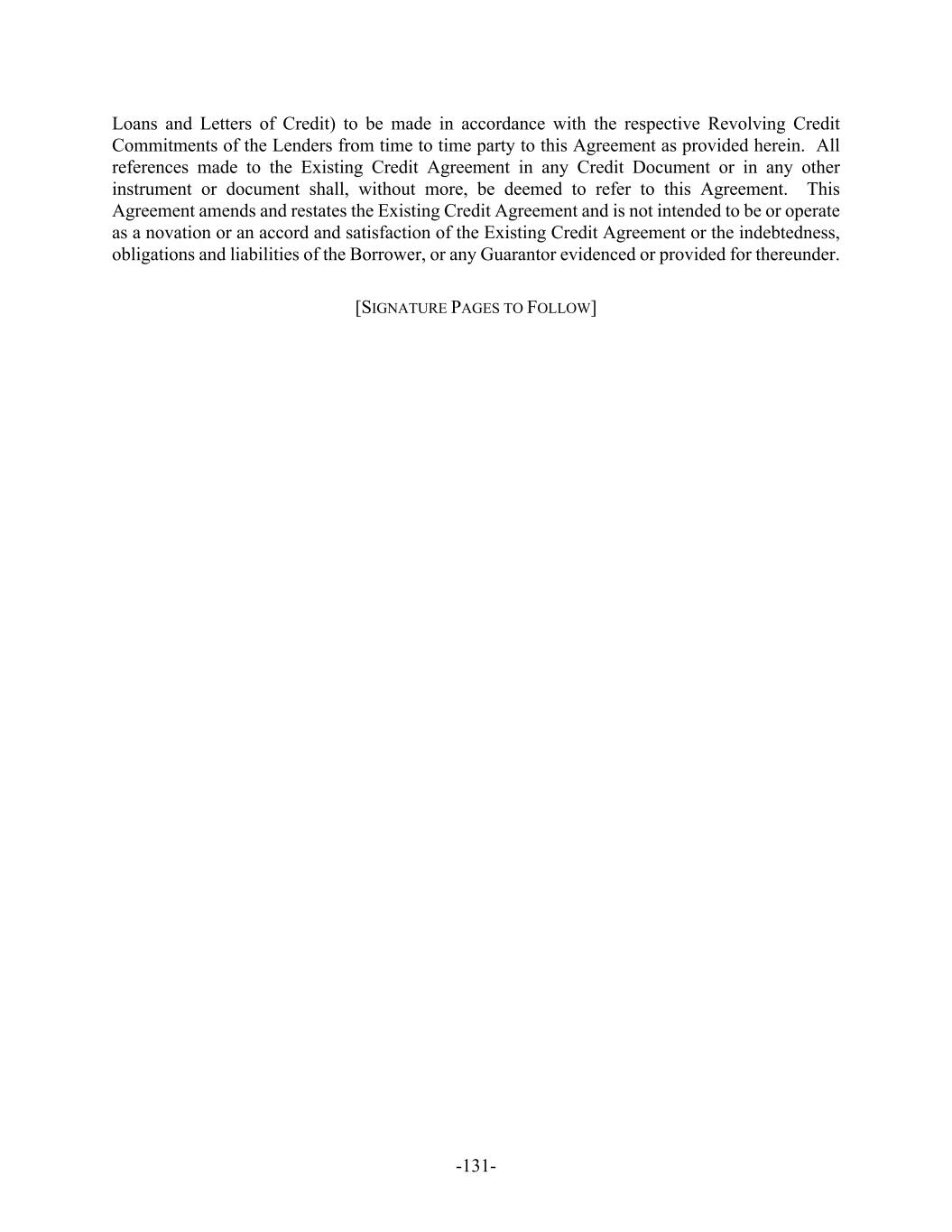 -131- Loans and Letters of Credit) to be made in accordance with the respective Revolving Credit Commitments of the Lenders from time to time party to this Agreement as provided herein. All references made to the Existing Credit Agreement in any Credit Document or in any other instrument or document shall, without more, be deemed to refer to this Agreement. This Agreement amends and restates the Existing Credit Agreement and is not intended to be or operate as a novation or an accord and satisfaction of the Existing Credit Agreement or the indebtedness, obligations and liabilities of the Borrower, or any Guarantor evidenced or provided for thereunder. [SIGNATURE PAGES TO FOLLOW]
