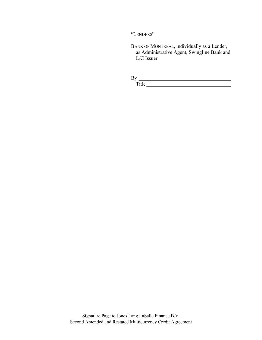 Signature Page to Jones Lang LaSalle Finance B.V. Second Amended and Restated Multicurrency Credit Agreement “LENDERS” BANK OF MONTREAL, individually as a Lender, as Administrative Agent, Swingline Bank and L/C Issuer By ____________________________________ Title _________________________________