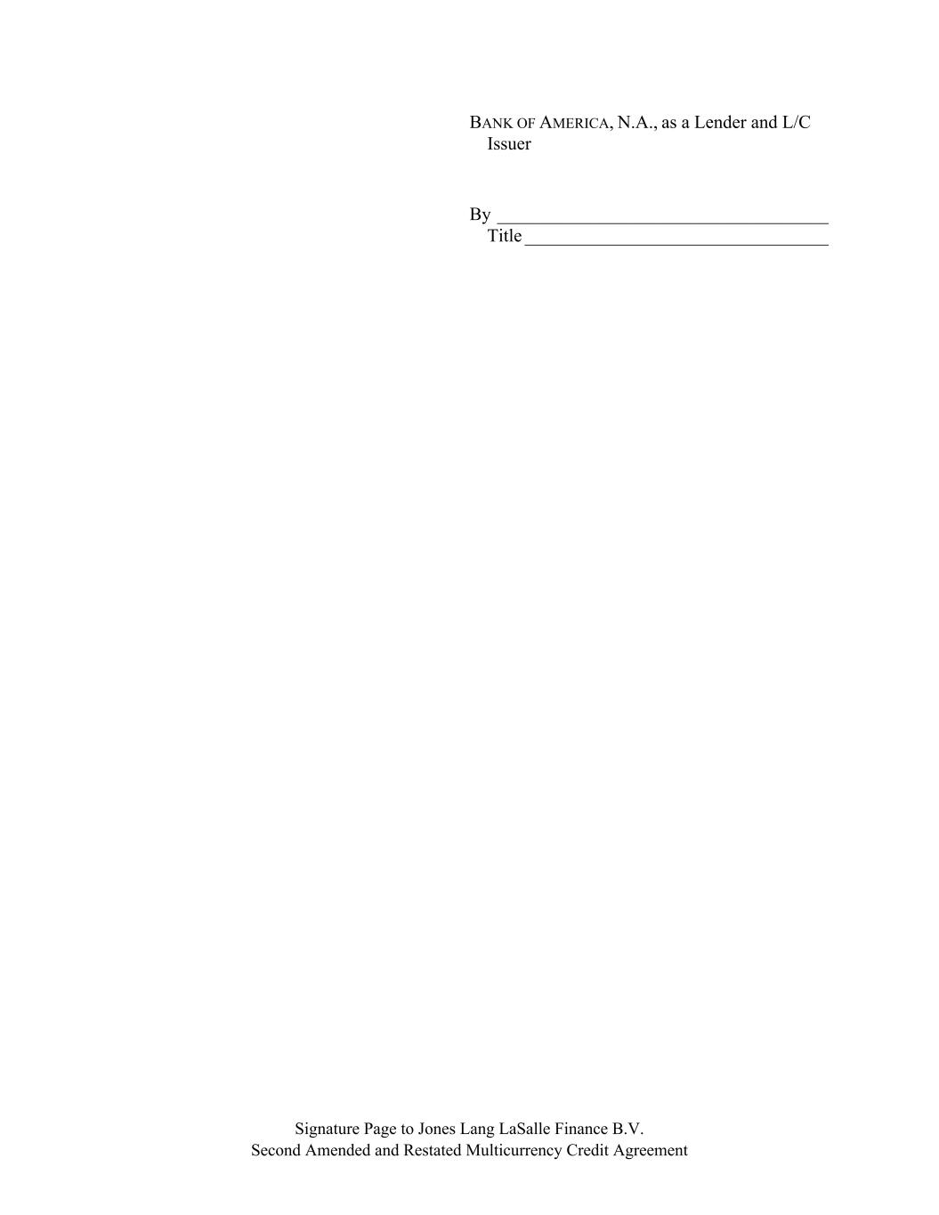 Signature Page to Jones Lang LaSalle Finance B.V. Second Amended and Restated Multicurrency Credit Agreement BANK OF AMERICA, N.A., as a Lender and L/C Issuer By ____________________________________ Title _________________________________