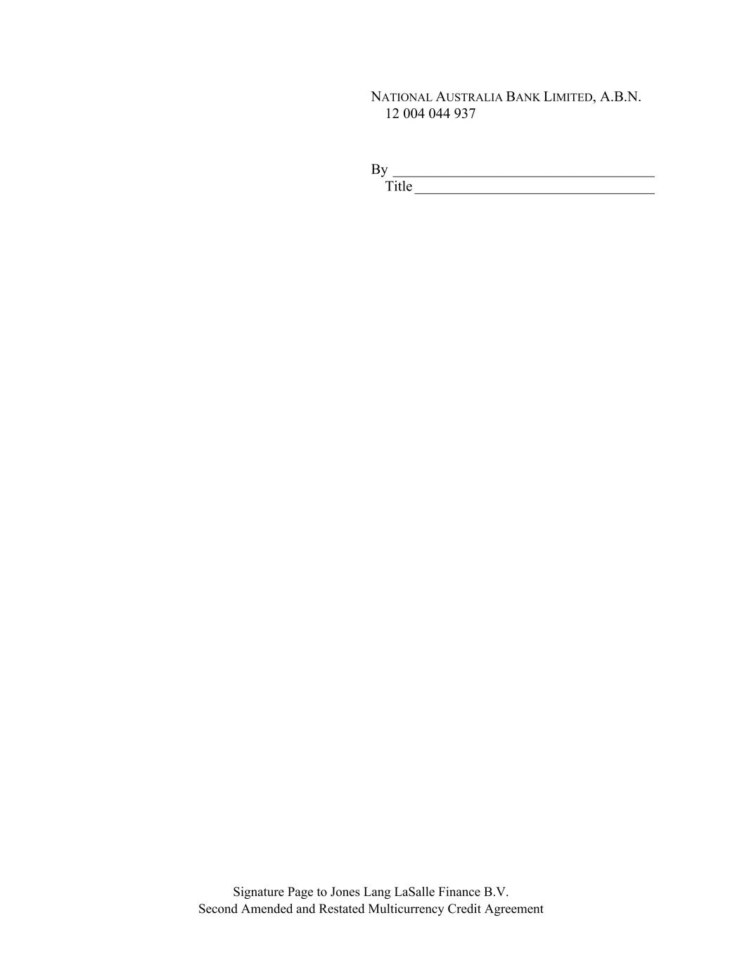 Signature Page to Jones Lang LaSalle Finance B.V. Second Amended and Restated Multicurrency Credit Agreement NATIONAL AUSTRALIA BANK LIMITED, A.B.N. 12 004 044 937 By ____________________________________ Title _________________________________