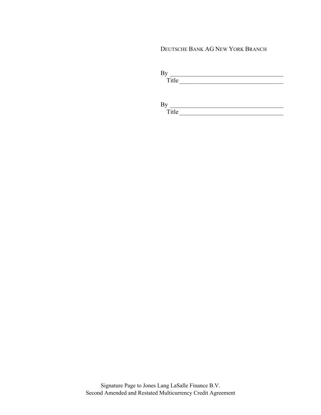Signature Page to Jones Lang LaSalle Finance B.V. Second Amended and Restated Multicurrency Credit Agreement DEUTSCHE BANK AG NEW YORK BRANCH By ____________________________________ Title _________________________________ By ____________________________________ Title _________________________________
