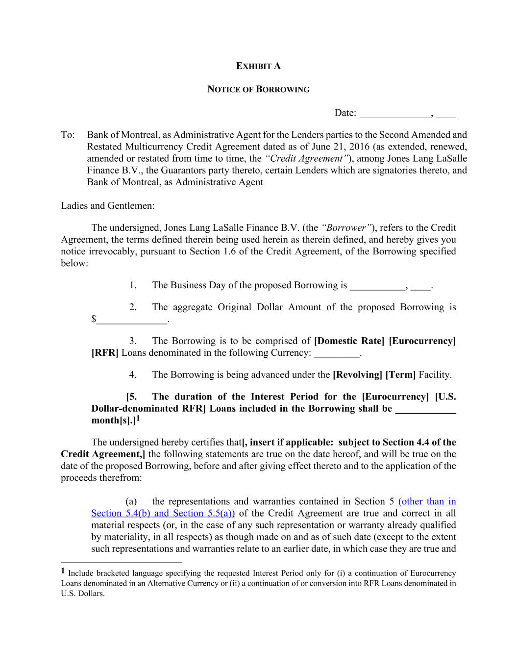 EXHIBIT A NOTICE OF BORROWING Date: ______________, ____ To: Bank of Montreal, as Administrative Agent for the Lenders parties to the Second Amended and Restated Multicurrency Credit Agreement dated as of June 21, 2016 (as extended, renewed, amended or restated from time to time, the “Credit Agreement”), among Jones Lang LaSalle Finance B.V., the Guarantors party thereto, certain Lenders which are signatories thereto, and Bank of Montreal, as Administrative Agent Ladies and Gentlemen: The undersigned, Jones Lang LaSalle Finance B.V. (the “Borrower”), refers to the Credit Agreement, the terms defined therein being used herein as therein defined, and hereby gives you notice irrevocably, pursuant to Section 1.6 of the Credit Agreement, of the Borrowing specified below: 1. The Business Day of the proposed Borrowing is ___________, ____. 2. The aggregate Original Dollar Amount of the proposed Borrowing is $______________. 3. The Borrowing is to be comprised of [Domestic Rate] [Eurocurrency] [RFR] Loans denominated in the following Currency: _________. 4. The Borrowing is being advanced under the [Revolving] [Term] Facility. [5. The duration of the Interest Period for the [Eurocurrency] [U.S. Dollar-denominated RFR] Loans included in the Borrowing shall be ____________ month[s].]1 The undersigned hereby certifies that[, insert if applicable: subject to Section 4.4 of the Credit Agreement,] the following statements are true on the date hereof, and will be true on the date of the proposed Borrowing, before and after giving effect thereto and to the application of the proceeds therefrom: (a) the representations and warranties contained in Section 5 (other than in Section 5.4(b) and Section 5.5(a)) of the Credit Agreement are true and correct in all material respects (or, in the case of any such representation or warranty already qualified by materiality, in all respects) as though made on and as of such date (except to the extent such representations and warranties relate to an earlier date, in which case they are true and 1 Include bracketed language specifying the requested Interest Period only for (i) a continuation of Eurocurrency Loans denominated in an Alternative Currency or (ii) a continuation of or conversion into RFR Loans denominated in U.S. Dollars.