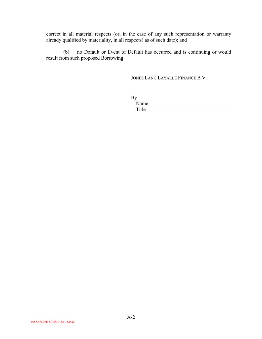 A-2 1055239.02B-CHISR02A - MSW correct in all material respects (or, in the case of any such representation or warranty already qualified by materiality, in all respects) as of such date); and (b) no Default or Event of Default has occurred and is continuing or would result from such proposed Borrowing. JONES LANG LASALLE FINANCE B.V. By ____________________________________ Name ________________________________ Title _________________________________