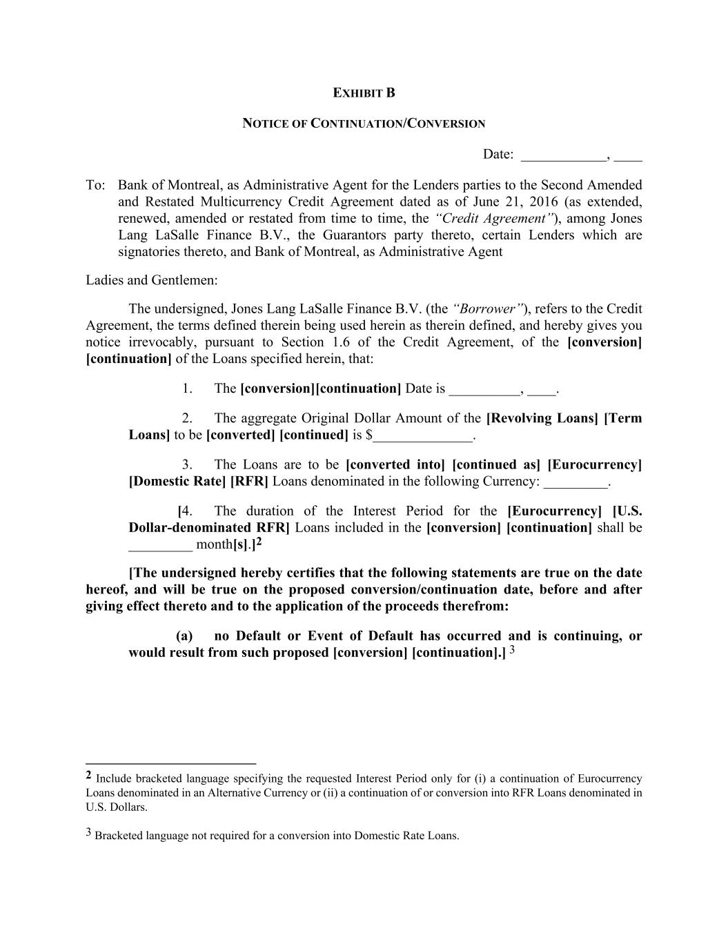 EXHIBIT B NOTICE OF CONTINUATION/CONVERSION Date: ____________, ____ To: Bank of Montreal, as Administrative Agent for the Lenders parties to the Second Amended and Restated Multicurrency Credit Agreement dated as of June 21, 2016 (as extended, renewed, amended or restated from time to time, the “Credit Agreement”), among Jones Lang LaSalle Finance B.V., the Guarantors party thereto, certain Lenders which are signatories thereto, and Bank of Montreal, as Administrative Agent Ladies and Gentlemen: The undersigned, Jones Lang LaSalle Finance B.V. (the “Borrower”), refers to the Credit Agreement, the terms defined therein being used herein as therein defined, and hereby gives you notice irrevocably, pursuant to Section 1.6 of the Credit Agreement, of the [conversion] [continuation] of the Loans specified herein, that: 1. The [conversion][continuation] Date is __________, ____. 2. The aggregate Original Dollar Amount of the [Revolving Loans] [Term Loans] to be [converted] [continued] is $______________. 3. The Loans are to be [converted into] [continued as] [Eurocurrency] [Domestic Rate] [RFR] Loans denominated in the following Currency: _________. [4. The duration of the Interest Period for the [Eurocurrency] [U.S. Dollar-denominated RFR] Loans included in the [conversion] [continuation] shall be _________ month[s].]2 [The undersigned hereby certifies that the following statements are true on the date hereof, and will be true on the proposed conversion/continuation date, before and after giving effect thereto and to the application of the proceeds therefrom: (a) no Default or Event of Default has occurred and is continuing, or would result from such proposed [conversion] [continuation].] 3 2 Include bracketed language specifying the requested Interest Period only for (i) a continuation of Eurocurrency Loans denominated in an Alternative Currency or (ii) a continuation of or conversion into RFR Loans denominated in U.S. Dollars. 3 Bracketed language not required for a conversion into Domestic Rate Loans.