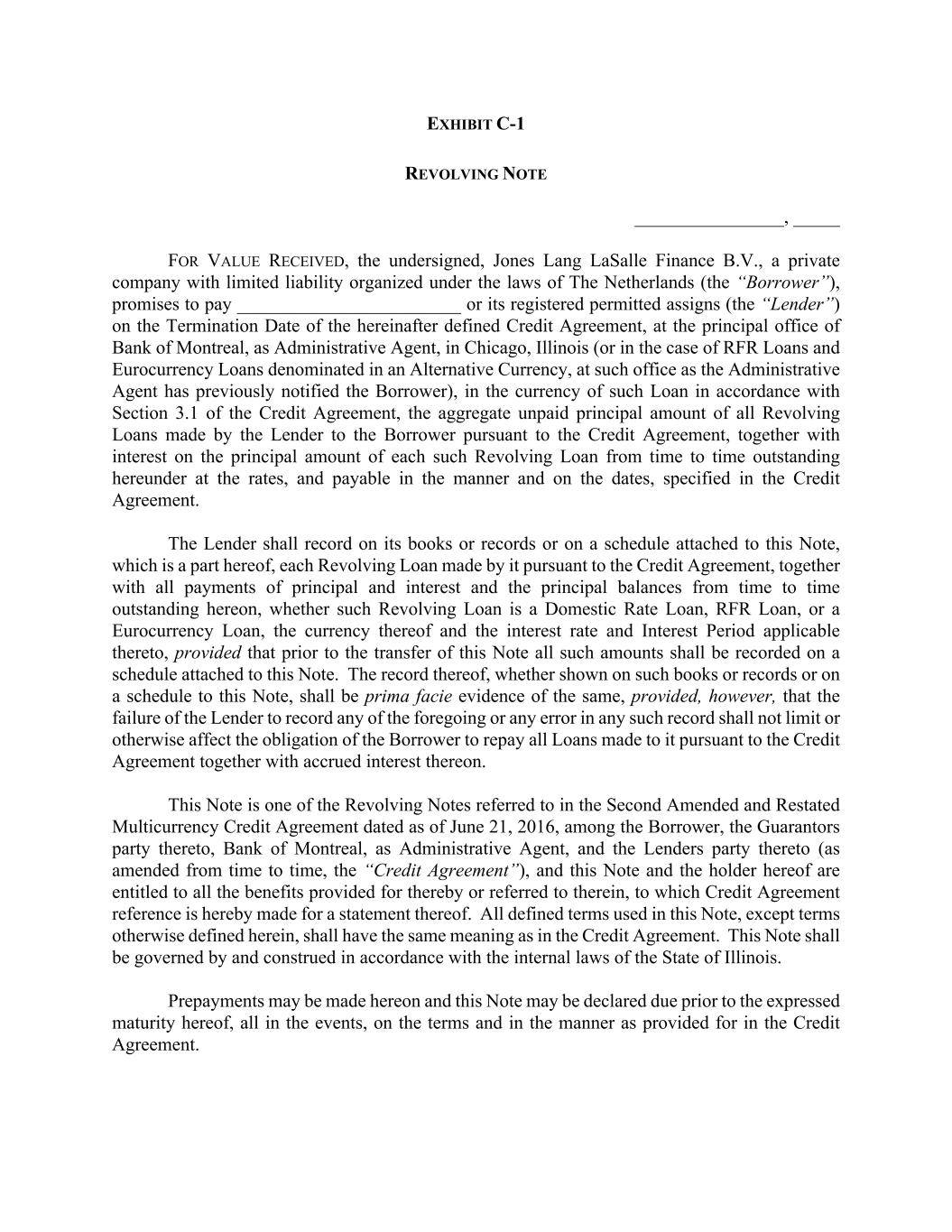 EXHIBIT C-1 REVOLVING NOTE ________________, _____ FOR VALUE RECEIVED, the undersigned, Jones Lang LaSalle Finance B.V., a private company with limited liability organized under the laws of The Netherlands (the “Borrower”), promises to pay ________________________ or its registered permitted assigns (the “Lender”) on the Termination Date of the hereinafter defined Credit Agreement, at the principal office of Bank of Montreal, as Administrative Agent, in Chicago, Illinois (or in the case of RFR Loans and Eurocurrency Loans denominated in an Alternative Currency, at such office as the Administrative Agent has previously notified the Borrower), in the currency of such Loan in accordance with Section 3.1 of the Credit Agreement, the aggregate unpaid principal amount of all Revolving Loans made by the Lender to the Borrower pursuant to the Credit Agreement, together with interest on the principal amount of each such Revolving Loan from time to time outstanding hereunder at the rates, and payable in the manner and on the dates, specified in the Credit Agreement. The Lender shall record on its books or records or on a schedule attached to this Note, which is a part hereof, each Revolving Loan made by it pursuant to the Credit Agreement, together with all payments of principal and interest and the principal balances from time to time outstanding hereon, whether such Revolving Loan is a Domestic Rate Loan, RFR Loan, or a Eurocurrency Loan, the currency thereof and the interest rate and Interest Period applicable thereto, provided that prior to the transfer of this Note all such amounts shall be recorded on a schedule attached to this Note. The record thereof, whether shown on such books or records or on a schedule to this Note, shall be prima facie evidence of the same, provided, however, that the failure of the Lender to record any of the foregoing or any error in any such record shall not limit or otherwise affect the obligation of the Borrower to repay all Loans made to it pursuant to the Credit Agreement together with accrued interest thereon. This Note is one of the Revolving Notes referred to in the Second Amended and Restated Multicurrency Credit Agreement dated as of June 21, 2016, among the Borrower, the Guarantors party thereto, Bank of Montreal, as Administrative Agent, and the Lenders party thereto (as amended from time to time, the “Credit Agreement”), and this Note and the holder hereof are entitled to all the benefits provided for thereby or referred to therein, to which Credit Agreement reference is hereby made for a statement thereof. All defined terms used in this Note, except terms otherwise defined herein, shall have the same meaning as in the Credit Agreement. This Note shall be governed by and construed in accordance with the internal laws of the State of Illinois. Prepayments may be made hereon and this Note may be declared due prior to the expressed maturity hereof, all in the events, on the terms and in the manner as provided for in the Credit Agreement.