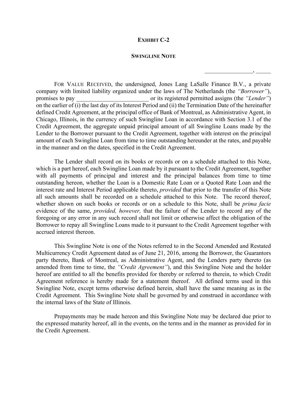 EXHIBIT C-2 SWINGLINE NOTE ________________, _____ FOR VALUE RECEIVED, the undersigned, Jones Lang LaSalle Finance B.V., a private company with limited liability organized under the laws of The Netherlands (the “Borrower”), promises to pay ________________________ or its registered permitted assigns (the “Lender”) on the earlier of (i) the last day of its Interest Period and (ii) the Termination Date of the hereinafter defined Credit Agreement, at the principal office of Bank of Montreal, as Administrative Agent, in Chicago, Illinois, in the currency of such Swingline Loan in accordance with Section 3.1 of the Credit Agreement, the aggregate unpaid principal amount of all Swingline Loans made by the Lender to the Borrower pursuant to the Credit Agreement, together with interest on the principal amount of each Swingline Loan from time to time outstanding hereunder at the rates, and payable in the manner and on the dates, specified in the Credit Agreement. The Lender shall record on its books or records or on a schedule attached to this Note, which is a part hereof, each Swingline Loan made by it pursuant to the Credit Agreement, together with all payments of principal and interest and the principal balances from time to time outstanding hereon, whether the Loan is a Domestic Rate Loan or a Quoted Rate Loan and the interest rate and Interest Period applicable thereto, provided that prior to the transfer of this Note all such amounts shall be recorded on a schedule attached to this Note. The record thereof, whether shown on such books or records or on a schedule to this Note, shall be prima facie evidence of the same, provided, however, that the failure of the Lender to record any of the foregoing or any error in any such record shall not limit or otherwise affect the obligation of the Borrower to repay all Swingline Loans made to it pursuant to the Credit Agreement together with accrued interest thereon. This Swingline Note is one of the Notes referred to in the Second Amended and Restated Multicurrency Credit Agreement dated as of June 21, 2016, among the Borrower, the Guarantors party thereto, Bank of Montreal, as Administrative Agent, and the Lenders party thereto (as amended from time to time, the “Credit Agreement”), and this Swingline Note and the holder hereof are entitled to all the benefits provided for thereby or referred to therein, to which Credit Agreement reference is hereby made for a statement thereof. All defined terms used in this Swingline Note, except terms otherwise defined herein, shall have the same meaning as in the Credit Agreement. This Swingline Note shall be governed by and construed in accordance with the internal laws of the State of Illinois. Prepayments may be made hereon and this Swingline Note may be declared due prior to the expressed maturity hereof, all in the events, on the terms and in the manner as provided for in the Credit Agreement.