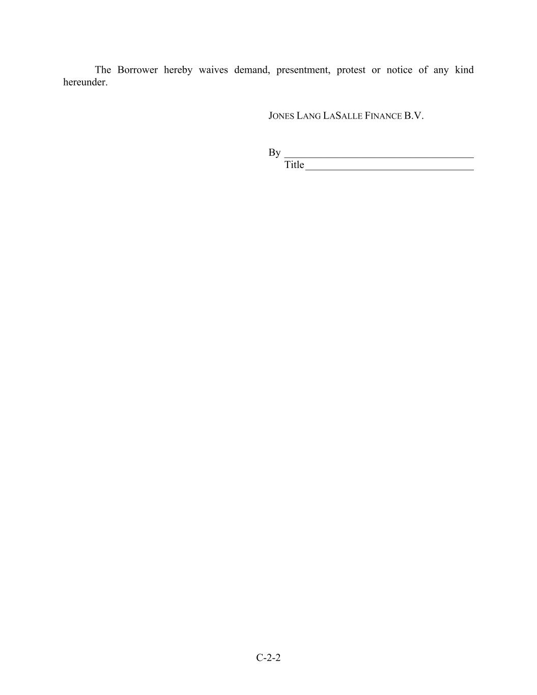 C-2-2 The Borrower hereby waives demand, presentment, protest or notice of any kind hereunder. JONES LANG LASALLE FINANCE B.V. By ____________________________________ Title________________________________