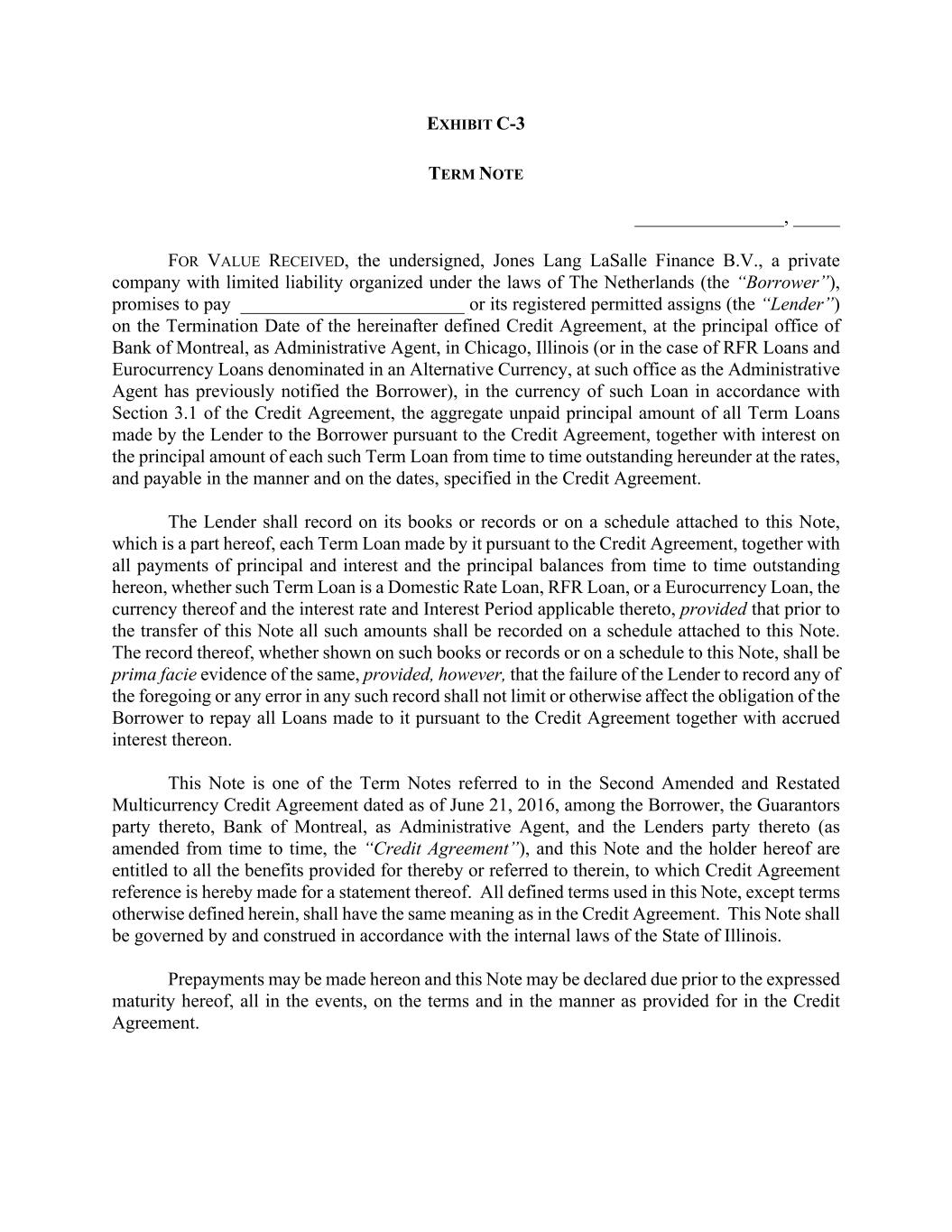 EXHIBIT C-3 TERM NOTE ________________, _____ FOR VALUE RECEIVED, the undersigned, Jones Lang LaSalle Finance B.V., a private company with limited liability organized under the laws of The Netherlands (the “Borrower”), promises to pay ________________________ or its registered permitted assigns (the “Lender”) on the Termination Date of the hereinafter defined Credit Agreement, at the principal office of Bank of Montreal, as Administrative Agent, in Chicago, Illinois (or in the case of RFR Loans and Eurocurrency Loans denominated in an Alternative Currency, at such office as the Administrative Agent has previously notified the Borrower), in the currency of such Loan in accordance with Section 3.1 of the Credit Agreement, the aggregate unpaid principal amount of all Term Loans made by the Lender to the Borrower pursuant to the Credit Agreement, together with interest on the principal amount of each such Term Loan from time to time outstanding hereunder at the rates, and payable in the manner and on the dates, specified in the Credit Agreement. The Lender shall record on its books or records or on a schedule attached to this Note, which is a part hereof, each Term Loan made by it pursuant to the Credit Agreement, together with all payments of principal and interest and the principal balances from time to time outstanding hereon, whether such Term Loan is a Domestic Rate Loan, RFR Loan, or a Eurocurrency Loan, the currency thereof and the interest rate and Interest Period applicable thereto, provided that prior to the transfer of this Note all such amounts shall be recorded on a schedule attached to this Note. The record thereof, whether shown on such books or records or on a schedule to this Note, shall be prima facie evidence of the same, provided, however, that the failure of the Lender to record any of the foregoing or any error in any such record shall not limit or otherwise affect the obligation of the Borrower to repay all Loans made to it pursuant to the Credit Agreement together with accrued interest thereon. This Note is one of the Term Notes referred to in the Second Amended and Restated Multicurrency Credit Agreement dated as of June 21, 2016, among the Borrower, the Guarantors party thereto, Bank of Montreal, as Administrative Agent, and the Lenders party thereto (as amended from time to time, the “Credit Agreement”), and this Note and the holder hereof are entitled to all the benefits provided for thereby or referred to therein, to which Credit Agreement reference is hereby made for a statement thereof. All defined terms used in this Note, except terms otherwise defined herein, shall have the same meaning as in the Credit Agreement. This Note shall be governed by and construed in accordance with the internal laws of the State of Illinois. Prepayments may be made hereon and this Note may be declared due prior to the expressed maturity hereof, all in the events, on the terms and in the manner as provided for in the Credit Agreement.