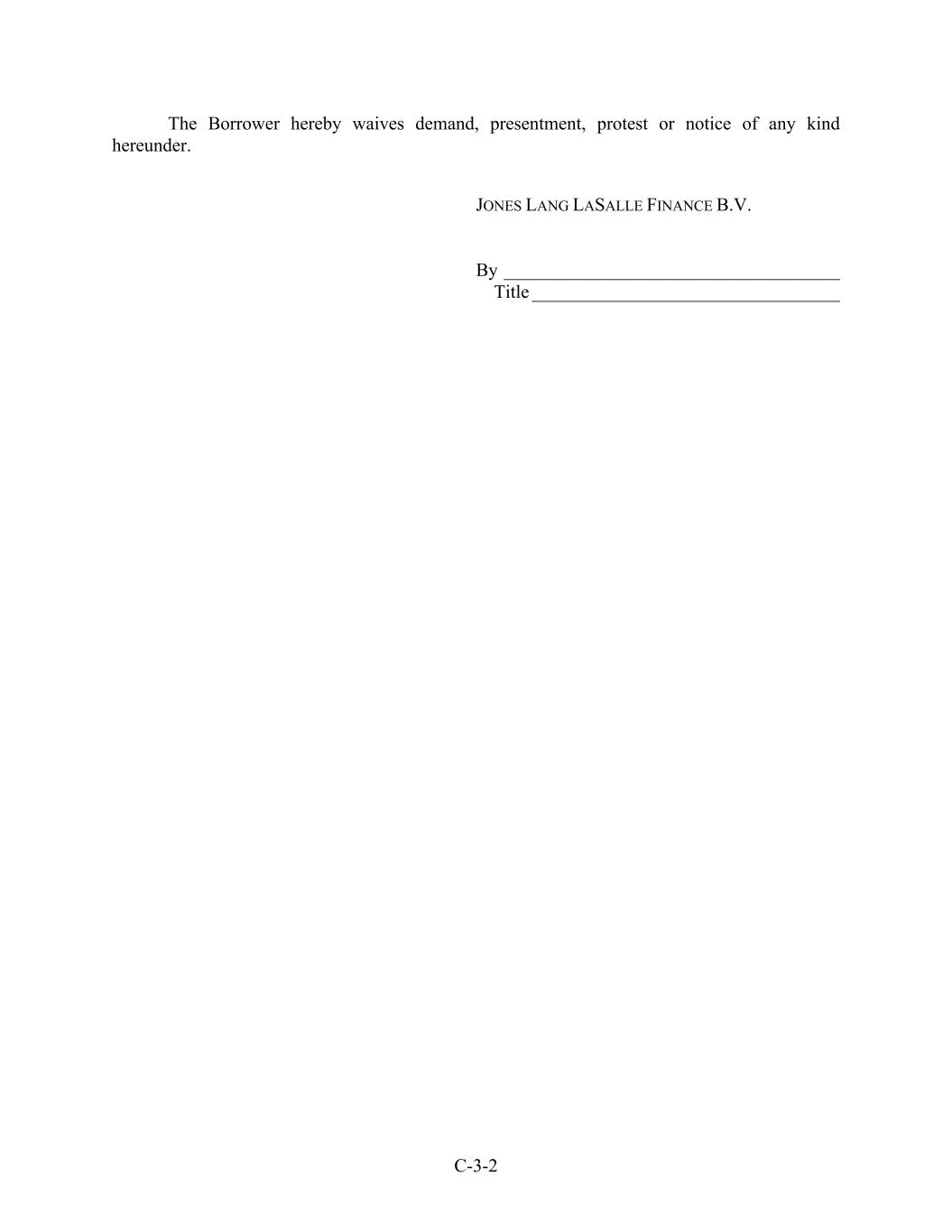 C-3-2 The Borrower hereby waives demand, presentment, protest or notice of any kind hereunder. JONES LANG LASALLE FINANCE B.V. By ____________________________________ Title _________________________________