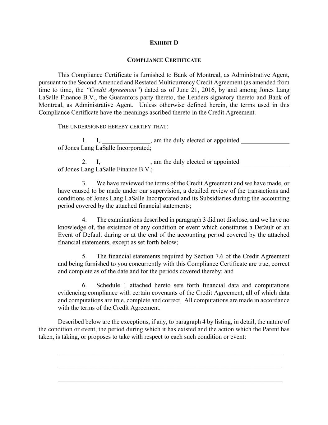 EXHIBIT D COMPLIANCE CERTIFICATE This Compliance Certificate is furnished to Bank of Montreal, as Administrative Agent, pursuant to the Second Amended and Restated Multicurrency Credit Agreement (as amended from time to time, the “Credit Agreement”) dated as of June 21, 2016, by and among Jones Lang LaSalle Finance B.V., the Guarantors party thereto, the Lenders signatory thereto and Bank of Montreal, as Administrative Agent. Unless otherwise defined herein, the terms used in this Compliance Certificate have the meanings ascribed thereto in the Credit Agreement. THE UNDERSIGNED HEREBY CERTIFY THAT: 1. I, _______________, am the duly elected or appointed _______________ of Jones Lang LaSalle Incorporated; 2. I, _______________, am the duly elected or appointed _______________ of Jones Lang LaSalle Finance B.V.; 3. We have reviewed the terms of the Credit Agreement and we have made, or have caused to be made under our supervision, a detailed review of the transactions and conditions of Jones Lang LaSalle Incorporated and its Subsidiaries during the accounting period covered by the attached financial statements; 4. The examinations described in paragraph 3 did not disclose, and we have no knowledge of, the existence of any condition or event which constitutes a Default or an Event of Default during or at the end of the accounting period covered by the attached financial statements, except as set forth below; 5. The financial statements required by Section 7.6 of the Credit Agreement and being furnished to you concurrently with this Compliance Certificate are true, correct and complete as of the date and for the periods covered thereby; and 6. Schedule 1 attached hereto sets forth financial data and computations evidencing compliance with certain covenants of the Credit Agreement, all of which data and computations are true, complete and correct. All computations are made in accordance with the terms of the Credit Agreement. Described below are the exceptions, if any, to paragraph 4 by listing, in detail, the nature of the condition or event, the period during which it has existed and the action which the Parent has taken, is taking, or proposes to take with respect to each such condition or event: ______________________________________________________________________ ______________________________________________________________________ ______________________________________________________________________