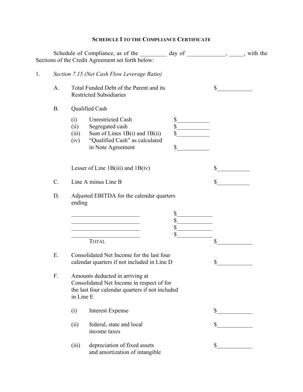SCHEDULE I TO THE COMPLIANCE CERTIFICATE Schedule of Compliance, as of the _________ day of _____________, _____, with the Sections of the Credit Agreement set forth below: 1. Section 7.15 (Net Cash Flow Leverage Ratio) A. Total Funded Debt of the Parent and its $____________ Restricted Subsidiaries B. Qualified Cash (i) Unrestricted Cash $___________ (ii) Segregated cash $___________ (iii) Sum of Lines 1B(i) and 1B(ii) $___________ (iv) “Qualified Cash” as calculated in Note Agreement $___________ Lesser of Line 1B(iii) and 1B(iv) $___________ C. Line A minus Line B $___________ D. Adjusted EBITDA for the calendar quarters ending _______________________ $____________ _______________________ $____________ _______________________ $____________ _______________________ $____________ TOTAL $____________ E. Consolidated Net Income for the last four calendar quarters if not included in Line D $____________ F. Amounts deducted in arriving at Consolidated Net Income in respect of for the last four calendar quarters if not included in Line E (i) Interest Expense $____________ (ii) federal, state and local $____________ income taxes (iii) depreciation of fixed assets $____________ and amortization of intangible