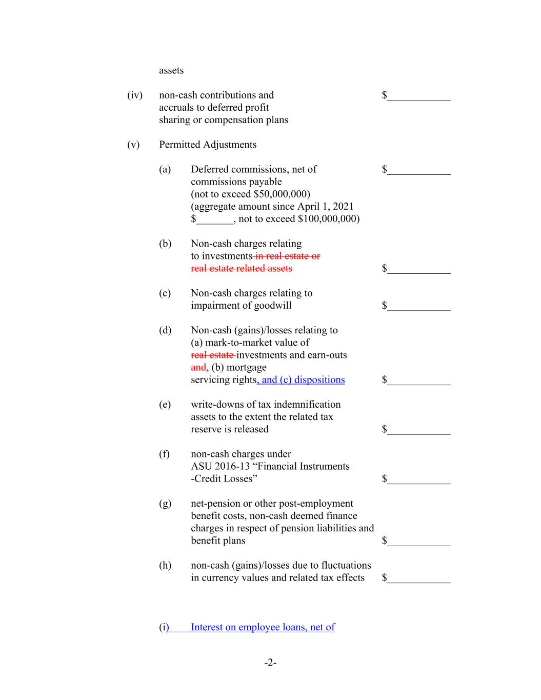 -2- assets (iv) non-cash contributions and $____________ accruals to deferred profit sharing or compensation plans (v) Permitted Adjustments (a) Deferred commissions, net of $____________ commissions payable (not to exceed $50,000,000) (aggregate amount since April 1, 2021 $_______, not to exceed $100,000,000) (b) Non-cash charges relating to investments in real estate or real estate related assets $____________ (c) Non-cash charges relating to impairment of goodwill $____________ (d) Non-cash (gains)/losses relating to (a) mark-to-market value of real estate investments and earn-outs and, (b) mortgage servicing rights, and (c) dispositions $____________ (e) write-downs of tax indemnification assets to the extent the related tax reserve is released $____________ (f) non-cash charges under ASU 2016-13 “Financial Instruments -Credit Losses” $____________ (g) net-pension or other post-employment benefit costs, non-cash deemed finance charges in respect of pension liabilities and benefit plans $____________ (h) non-cash (gains)/losses due to fluctuations in currency values and related tax effects $____________ (i) Interest on employee loans, net of