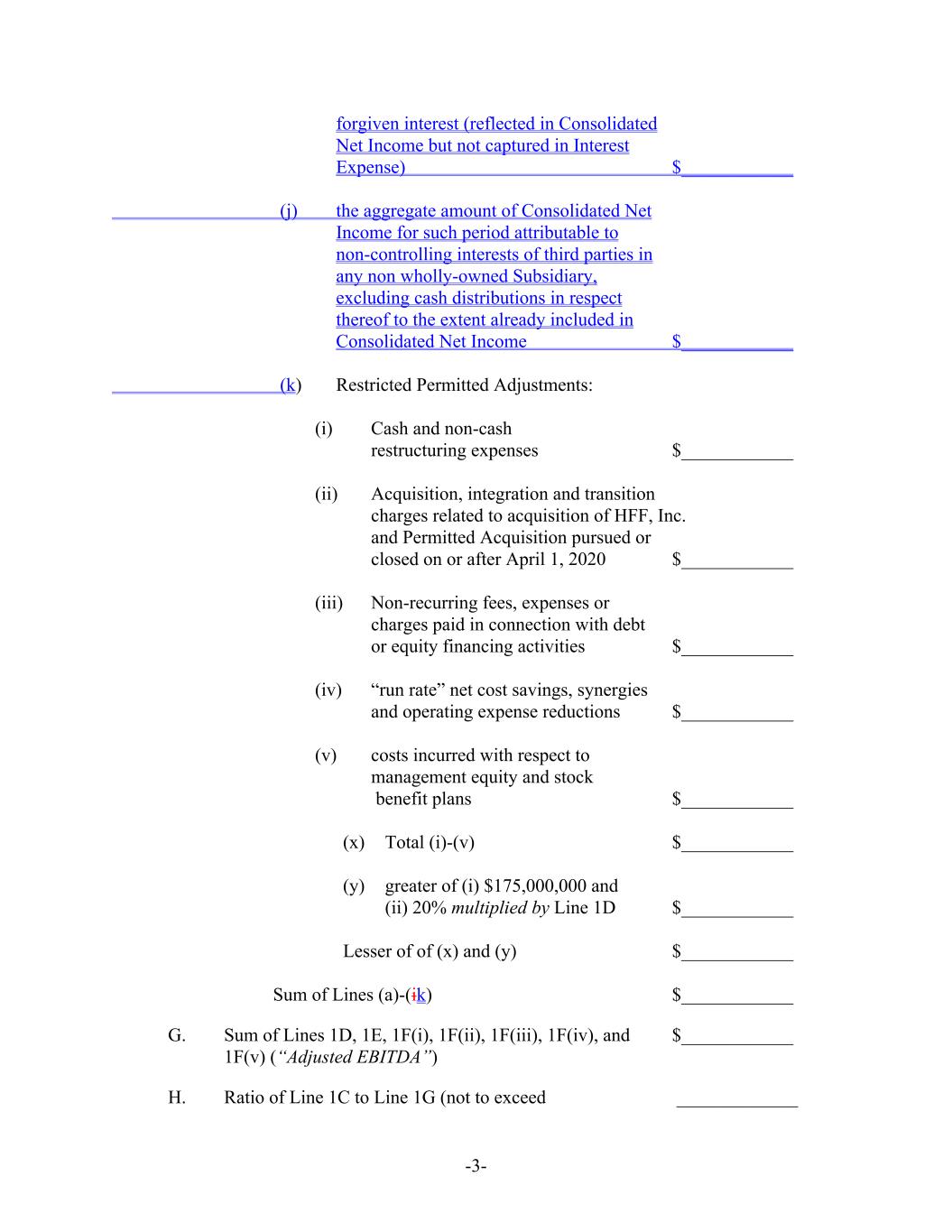 -3- forgiven interest (reflected in Consolidated Net Income but not captured in Interest Expense) $____________ (j) the aggregate amount of Consolidated Net Income for such period attributable to non-controlling interests of third parties in any non wholly-owned Subsidiary, excluding cash distributions in respect thereof to the extent already included in Consolidated Net Income $____________ (k) Restricted Permitted Adjustments: (i) Cash and non-cash restructuring expenses $____________ (ii) Acquisition, integration and transition charges related to acquisition of HFF, Inc. and Permitted Acquisition pursued or closed on or after April 1, 2020 $____________ (iii) Non-recurring fees, expenses or charges paid in connection with debt or equity financing activities $____________ (iv) “run rate” net cost savings, synergies and operating expense reductions $____________ (v) costs incurred with respect to management equity and stock benefit plans $____________ (x) Total (i)-(v) $____________ (y) greater of (i) $175,000,000 and (ii) 20% multiplied by Line 1D $____________ Lesser of of (x) and (y) $____________ Sum of Lines (a)-(ik) $____________ G. Sum of Lines 1D, 1E, 1F(i), 1F(ii), 1F(iii), 1F(iv), and $____________ 1F(v) (“Adjusted EBITDA”) H. Ratio of Line 1C to Line 1G (not to exceed _____________