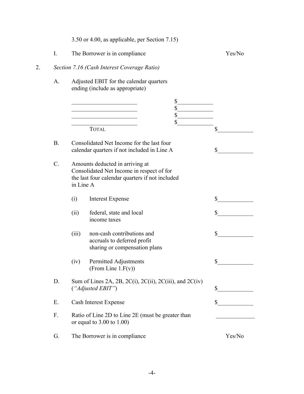 -4- 3.50 or 4.00, as applicable, per Section 7.15) I. The Borrower is in compliance Yes/No 2. Section 7.16 (Cash Interest Coverage Ratio) A. Adjusted EBIT for the calendar quarters ending (include as appropriate) ______________________ $____________ ______________________ $____________ ______________________ $____________ ______________________ $____________ TOTAL $____________ B. Consolidated Net Income for the last four calendar quarters if not included in Line A $____________ C. Amounts deducted in arriving at Consolidated Net Income in respect of for the last four calendar quarters if not included in Line A (i) Interest Expense $____________ (ii) federal, state and local $____________ income taxes (iii) non-cash contributions and $____________ accruals to deferred profit sharing or compensation plans (iv) Permitted Adjustments $____________ (From Line 1.F(v)) D. Sum of Lines 2A, 2B, 2C(i), 2C(ii), 2C(iii), and 2C(iv) (“Adjusted EBIT”) $____________ E. Cash Interest Expense $____________ F. Ratio of Line 2D to Line 2E (must be greater than _____________ or equal to 3.00 to 1.00) G. The Borrower is in compliance Yes/No