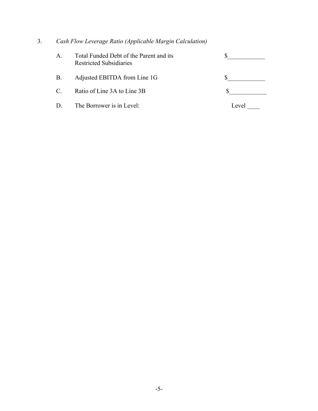 -5- 3. Cash Flow Leverage Ratio (Applicable Margin Calculation) A. Total Funded Debt of the Parent and its $____________ Restricted Subsidiaries B. Adjusted EBITDA from Line 1G $____________ C. Ratio of Line 3A to Line 3B $____________ D. The Borrower is in Level: Level ____