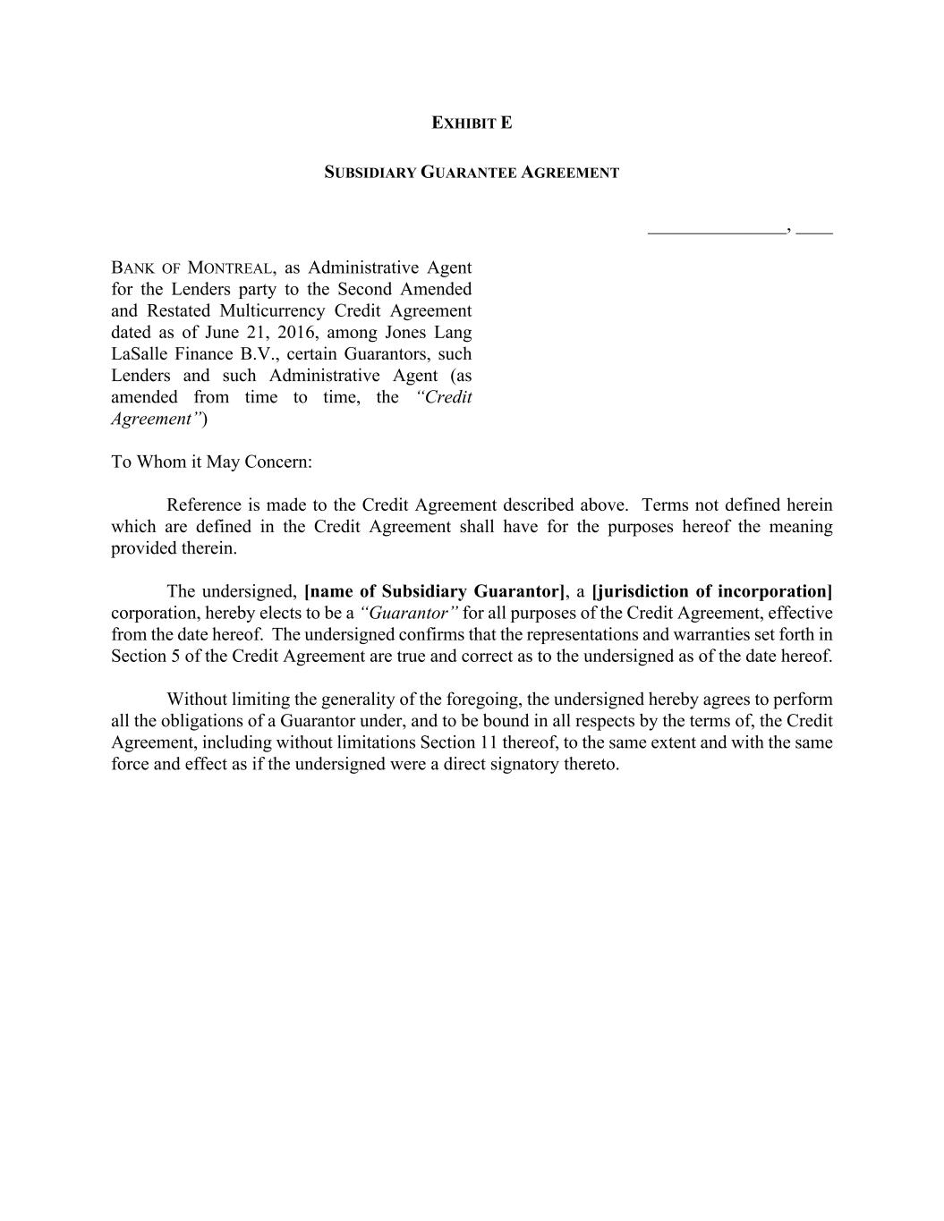 EXHIBIT E SUBSIDIARY GUARANTEE AGREEMENT _______________, ____ BANK OF MONTREAL, as Administrative Agent for the Lenders party to the Second Amended and Restated Multicurrency Credit Agreement dated as of June 21, 2016, among Jones Lang LaSalle Finance B.V., certain Guarantors, such Lenders and such Administrative Agent (as amended from time to time, the “Credit Agreement”) To Whom it May Concern: Reference is made to the Credit Agreement described above. Terms not defined herein which are defined in the Credit Agreement shall have for the purposes hereof the meaning provided therein. The undersigned, [name of Subsidiary Guarantor], a [jurisdiction of incorporation] corporation, hereby elects to be a “Guarantor” for all purposes of the Credit Agreement, effective from the date hereof. The undersigned confirms that the representations and warranties set forth in Section 5 of the Credit Agreement are true and correct as to the undersigned as of the date hereof. Without limiting the generality of the foregoing, the undersigned hereby agrees to perform all the obligations of a Guarantor under, and to be bound in all respects by the terms of, the Credit Agreement, including without limitations Section 11 thereof, to the same extent and with the same force and effect as if the undersigned were a direct signatory thereto.