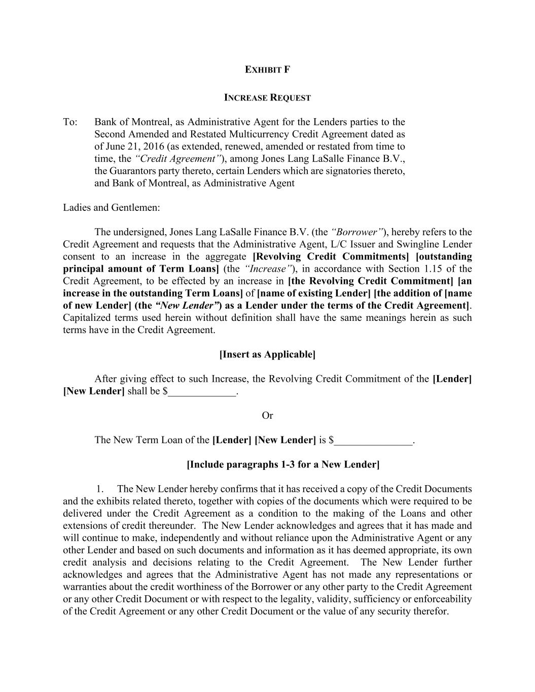 EXHIBIT F INCREASE REQUEST To: Bank of Montreal, as Administrative Agent for the Lenders parties to the Second Amended and Restated Multicurrency Credit Agreement dated as of June 21, 2016 (as extended, renewed, amended or restated from time to time, the “Credit Agreement”), among Jones Lang LaSalle Finance B.V., the Guarantors party thereto, certain Lenders which are signatories thereto, and Bank of Montreal, as Administrative Agent Ladies and Gentlemen: The undersigned, Jones Lang LaSalle Finance B.V. (the “Borrower”), hereby refers to the Credit Agreement and requests that the Administrative Agent, L/C Issuer and Swingline Lender consent to an increase in the aggregate [Revolving Credit Commitments] [outstanding principal amount of Term Loans] (the “Increase”), in accordance with Section 1.15 of the Credit Agreement, to be effected by an increase in [the Revolving Credit Commitment] [an increase in the outstanding Term Loans] of [name of existing Lender] [the addition of [name of new Lender] (the “New Lender”) as a Lender under the terms of the Credit Agreement]. Capitalized terms used herein without definition shall have the same meanings herein as such terms have in the Credit Agreement. [Insert as Applicable] After giving effect to such Increase, the Revolving Credit Commitment of the [Lender] [New Lender] shall be $_____________. Or The New Term Loan of the [Lender] [New Lender] is $_______________. [Include paragraphs 1-3 for a New Lender] 1. The New Lender hereby confirms that it has received a copy of the Credit Documents and the exhibits related thereto, together with copies of the documents which were required to be delivered under the Credit Agreement as a condition to the making of the Loans and other extensions of credit thereunder. The New Lender acknowledges and agrees that it has made and will continue to make, independently and without reliance upon the Administrative Agent or any other Lender and based on such documents and information as it has deemed appropriate, its own credit analysis and decisions relating to the Credit Agreement. The New Lender further acknowledges and agrees that the Administrative Agent has not made any representations or warranties about the credit worthiness of the Borrower or any other party to the Credit Agreement or any other Credit Document or with respect to the legality, validity, sufficiency or enforceability of the Credit Agreement or any other Credit Document or the value of any security therefor.