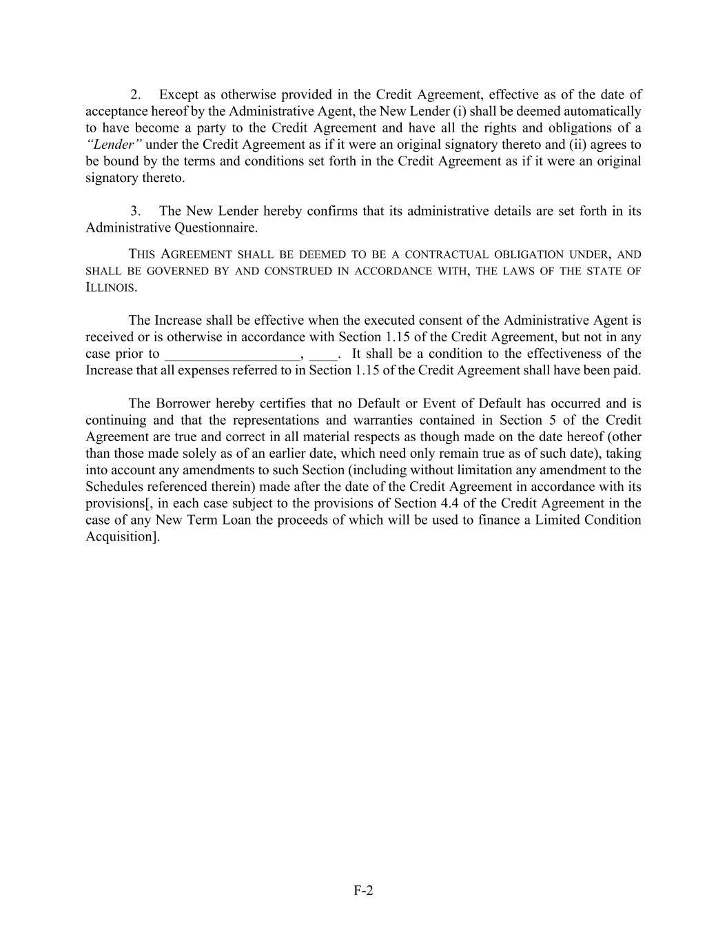 F-2 2. Except as otherwise provided in the Credit Agreement, effective as of the date of acceptance hereof by the Administrative Agent, the New Lender (i) shall be deemed automatically to have become a party to the Credit Agreement and have all the rights and obligations of a “Lender” under the Credit Agreement as if it were an original signatory thereto and (ii) agrees to be bound by the terms and conditions set forth in the Credit Agreement as if it were an original signatory thereto. 3. The New Lender hereby confirms that its administrative details are set forth in its Administrative Questionnaire. THIS AGREEMENT SHALL BE DEEMED TO BE A CONTRACTUAL OBLIGATION UNDER, AND SHALL BE GOVERNED BY AND CONSTRUED IN ACCORDANCE WITH, THE LAWS OF THE STATE OF ILLINOIS. The Increase shall be effective when the executed consent of the Administrative Agent is received or is otherwise in accordance with Section 1.15 of the Credit Agreement, but not in any case prior to ___________________, ____. It shall be a condition to the effectiveness of the Increase that all expenses referred to in Section 1.15 of the Credit Agreement shall have been paid. The Borrower hereby certifies that no Default or Event of Default has occurred and is continuing and that the representations and warranties contained in Section 5 of the Credit Agreement are true and correct in all material respects as though made on the date hereof (other than those made solely as of an earlier date, which need only remain true as of such date), taking into account any amendments to such Section (including without limitation any amendment to the Schedules referenced therein) made after the date of the Credit Agreement in accordance with its provisions[, in each case subject to the provisions of Section 4.4 of the Credit Agreement in the case of any New Term Loan the proceeds of which will be used to finance a Limited Condition Acquisition].