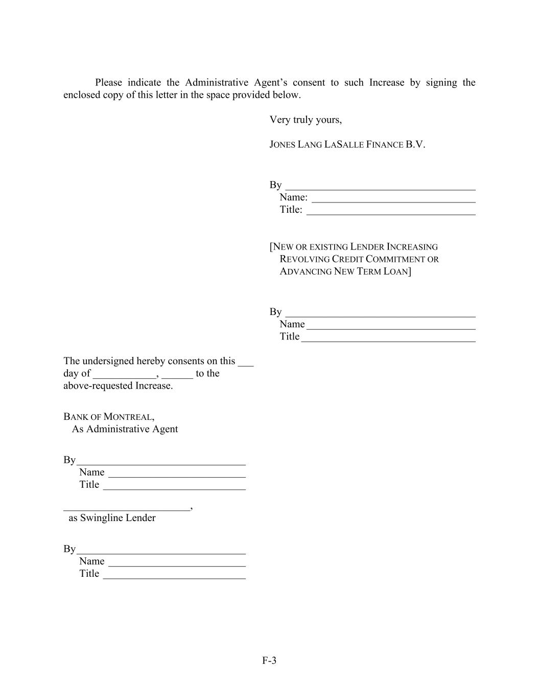 F-3 Please indicate the Administrative Agent’s consent to such Increase by signing the enclosed copy of this letter in the space provided below. Very truly yours, JONES LANG LASALLE FINANCE B.V. By ____________________________________ Name: _______________________________ Title: ________________________________ [NEW OR EXISTING LENDER INCREASING REVOLVING CREDIT COMMITMENT OR ADVANCING NEW TERM LOAN] By ____________________________________ Name ________________________________ Title _________________________________ The undersigned hereby consents on this ___ day of ____________, ______ to the above-requested Increase. BANK OF MONTREAL, As Administrative Agent By________________________________ Name __________________________ Title ___________________________ ________________________, as Swingline Lender By________________________________ Name __________________________ Title ___________________________