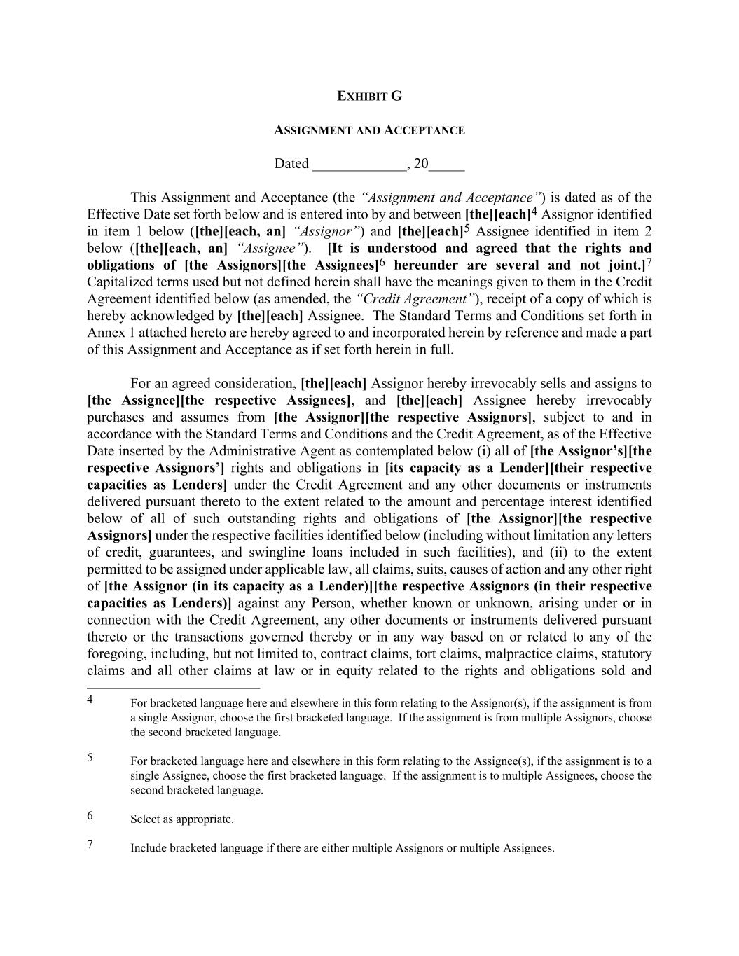 EXHIBIT G ASSIGNMENT AND ACCEPTANCE Dated _____________, 20_____ This Assignment and Acceptance (the “Assignment and Acceptance”) is dated as of the Effective Date set forth below and is entered into by and between [the][each]4 Assignor identified in item 1 below ([the][each, an] “Assignor”) and [the][each]5 Assignee identified in item 2 below ([the][each, an] “Assignee”). [It is understood and agreed that the rights and obligations of [the Assignors][the Assignees]6 hereunder are several and not joint.]7 Capitalized terms used but not defined herein shall have the meanings given to them in the Credit Agreement identified below (as amended, the “Credit Agreement”), receipt of a copy of which is hereby acknowledged by [the][each] Assignee. The Standard Terms and Conditions set forth in Annex 1 attached hereto are hereby agreed to and incorporated herein by reference and made a part of this Assignment and Acceptance as if set forth herein in full. For an agreed consideration, [the][each] Assignor hereby irrevocably sells and assigns to [the Assignee][the respective Assignees], and [the][each] Assignee hereby irrevocably purchases and assumes from [the Assignor][the respective Assignors], subject to and in accordance with the Standard Terms and Conditions and the Credit Agreement, as of the Effective Date inserted by the Administrative Agent as contemplated below (i) all of [the Assignor’s][the respective Assignors’] rights and obligations in [its capacity as a Lender][their respective capacities as Lenders] under the Credit Agreement and any other documents or instruments delivered pursuant thereto to the extent related to the amount and percentage interest identified below of all of such outstanding rights and obligations of [the Assignor][the respective Assignors] under the respective facilities identified below (including without limitation any letters of credit, guarantees, and swingline loans included in such facilities), and (ii) to the extent permitted to be assigned under applicable law, all claims, suits, causes of action and any other right of [the Assignor (in its capacity as a Lender)][the respective Assignors (in their respective capacities as Lenders)] against any Person, whether known or unknown, arising under or in connection with the Credit Agreement, any other documents or instruments delivered pursuant thereto or the transactions governed thereby or in any way based on or related to any of the foregoing, including, but not limited to, contract claims, tort claims, malpractice claims, statutory claims and all other claims at law or in equity related to the rights and obligations sold and 4 For bracketed language here and elsewhere in this form relating to the Assignor(s), if the assignment is from a single Assignor, choose the first bracketed language. If the assignment is from multiple Assignors, choose the second bracketed language. 5 For bracketed language here and elsewhere in this form relating to the Assignee(s), if the assignment is to a single Assignee, choose the first bracketed language. If the assignment is to multiple Assignees, choose the second bracketed language. 6 Select as appropriate. 7 Include bracketed language if there are either multiple Assignors or multiple Assignees.
