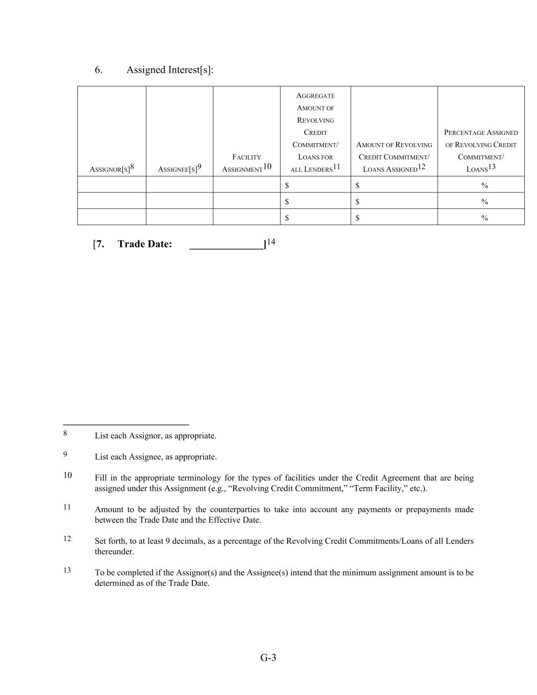 G-3 6. Assigned Interest[s]: ASSIGNOR[S]8 ASSIGNEE[S]9 FACILITY ASSIGNMENT10 AGGREGATE AMOUNT OF REVOLVING CREDIT COMMITMENT/ LOANS FOR ALL LENDERS11 AMOUNT OF REVOLVING CREDIT COMMITMENT/ LOANS ASSIGNED12 PERCENTAGE ASSIGNED OF REVOLVING CREDIT COMMITMENT/ LOANS13 $ $ % $ $ % $ $ % [7. Trade Date: ______________]14 8 List each Assignor, as appropriate. 9 List each Assignee, as appropriate. 10 Fill in the appropriate terminology for the types of facilities under the Credit Agreement that are being assigned under this Assignment (e.g., “Revolving Credit Commitment,” “Term Facility,” etc.). 11 Amount to be adjusted by the counterparties to take into account any payments or prepayments made between the Trade Date and the Effective Date. 12 Set forth, to at least 9 decimals, as a percentage of the Revolving Credit Commitments/Loans of all Lenders thereunder. 13 To be completed if the Assignor(s) and the Assignee(s) intend that the minimum assignment amount is to be determined as of the Trade Date.