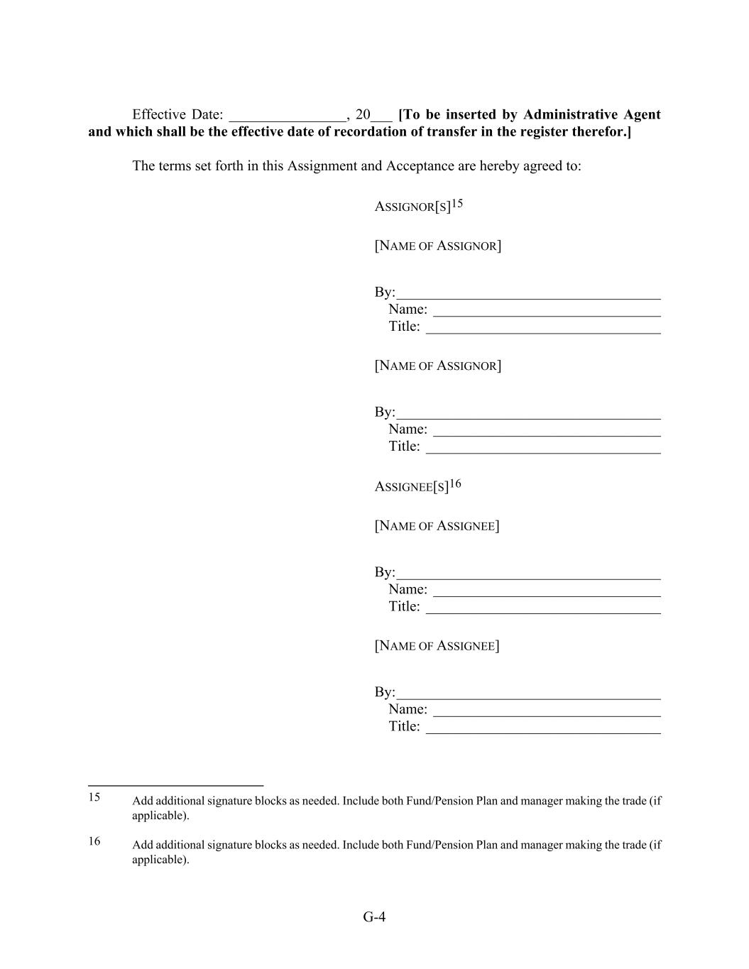 G-4 Effective Date: ________________, 20___ [To be inserted by Administrative Agent and which shall be the effective date of recordation of transfer in the register therefor.] The terms set forth in this Assignment and Acceptance are hereby agreed to: ASSIGNOR[S]15 [NAME OF ASSIGNOR] By:____________________________________ Name: _______________________________ Title: ________________________________ [NAME OF ASSIGNOR] By:____________________________________ Name: _______________________________ Title: ________________________________ ASSIGNEE[S]16 [NAME OF ASSIGNEE] By:____________________________________ Name: _______________________________ Title: ________________________________ [NAME OF ASSIGNEE] By:____________________________________ Name: _______________________________ Title: ________________________________ 15 Add additional signature blocks as needed. Include both Fund/Pension Plan and manager making the trade (if applicable). 16 Add additional signature blocks as needed. Include both Fund/Pension Plan and manager making the trade (if applicable).