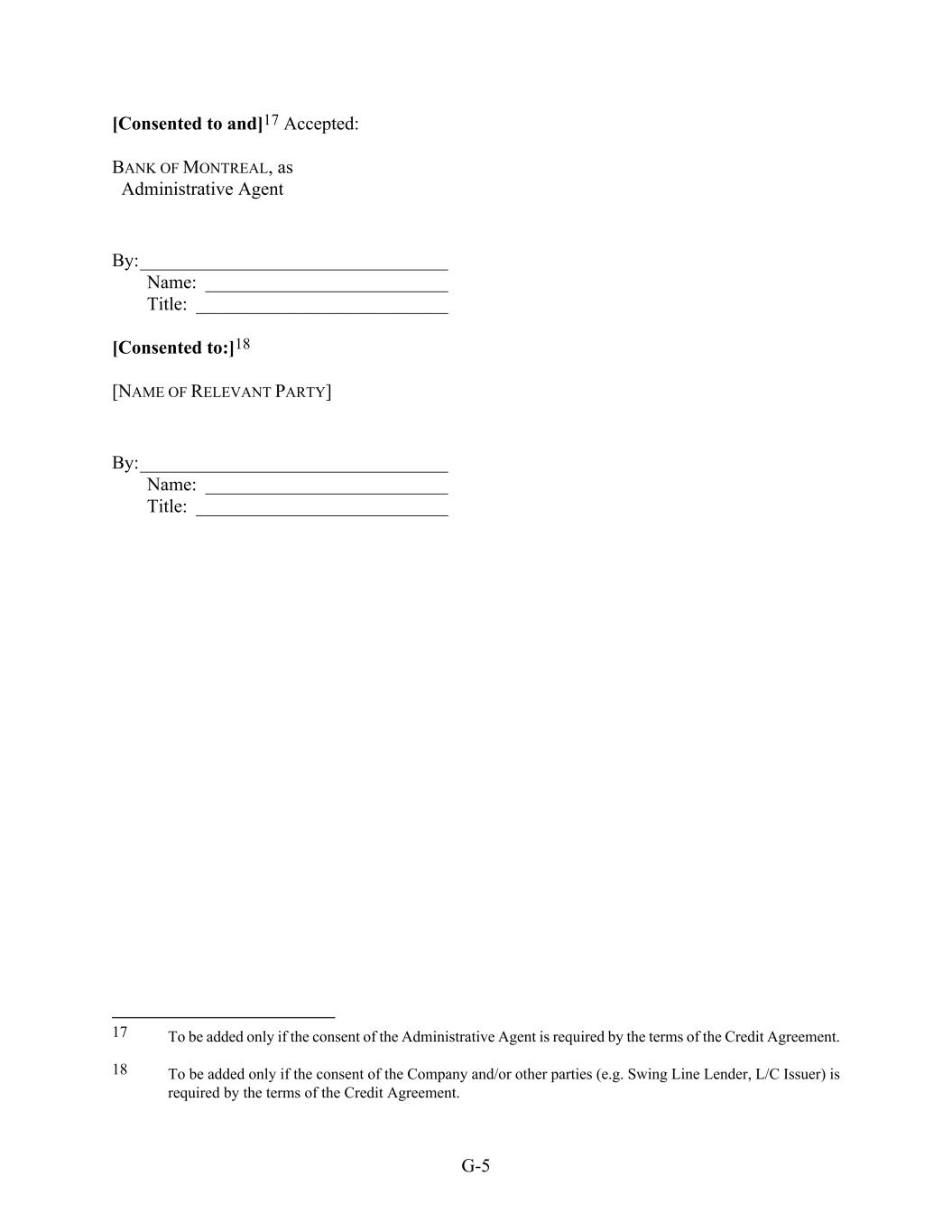 G-5 [Consented to and]17 Accepted: BANK OF MONTREAL, as Administrative Agent By:_________________________________ Name: __________________________ Title: ___________________________ [Consented to:]18 [NAME OF RELEVANT PARTY] By:_________________________________ Name: __________________________ Title: ___________________________ 17 To be added only if the consent of the Administrative Agent is required by the terms of the Credit Agreement. 18 To be added only if the consent of the Company and/or other parties (e.g. Swing Line Lender, L/C Issuer) is required by the terms of the Credit Agreement.