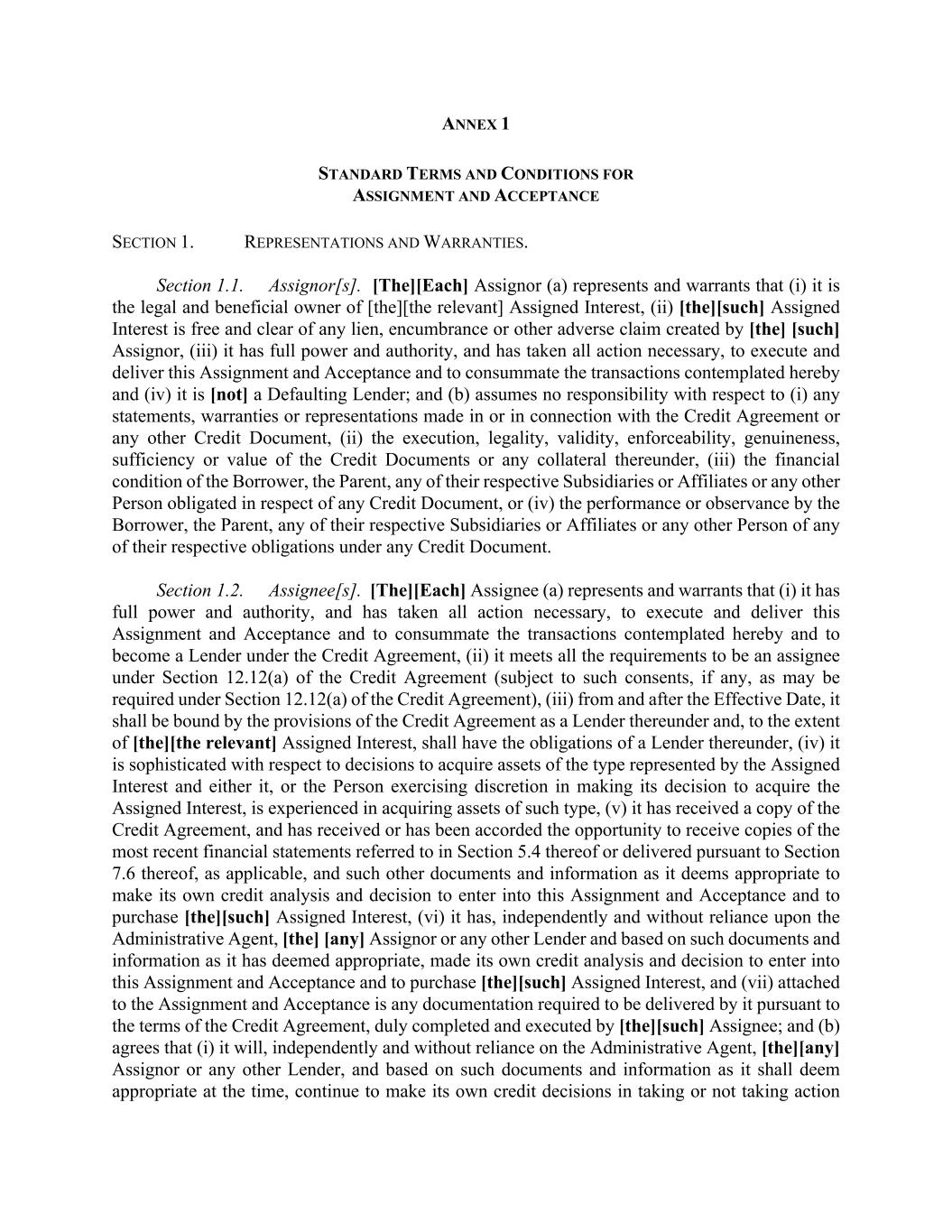 ANNEX 1 STANDARD TERMS AND CONDITIONS FOR ASSIGNMENT AND ACCEPTANCE SECTION 1. REPRESENTATIONS AND WARRANTIES. Section 1.1. Assignor[s]. [The][Each] Assignor (a) represents and warrants that (i) it is the legal and beneficial owner of [the][the relevant] Assigned Interest, (ii) [the][such] Assigned Interest is free and clear of any lien, encumbrance or other adverse claim created by [the] [such] Assignor, (iii) it has full power and authority, and has taken all action necessary, to execute and deliver this Assignment and Acceptance and to consummate the transactions contemplated hereby and (iv) it is [not] a Defaulting Lender; and (b) assumes no responsibility with respect to (i) any statements, warranties or representations made in or in connection with the Credit Agreement or any other Credit Document, (ii) the execution, legality, validity, enforceability, genuineness, sufficiency or value of the Credit Documents or any collateral thereunder, (iii) the financial condition of the Borrower, the Parent, any of their respective Subsidiaries or Affiliates or any other Person obligated in respect of any Credit Document, or (iv) the performance or observance by the Borrower, the Parent, any of their respective Subsidiaries or Affiliates or any other Person of any of their respective obligations under any Credit Document. Section 1.2. Assignee[s]. [The][Each] Assignee (a) represents and warrants that (i) it has full power and authority, and has taken all action necessary, to execute and deliver this Assignment and Acceptance and to consummate the transactions contemplated hereby and to become a Lender under the Credit Agreement, (ii) it meets all the requirements to be an assignee under Section 12.12(a) of the Credit Agreement (subject to such consents, if any, as may be required under Section 12.12(a) of the Credit Agreement), (iii) from and after the Effective Date, it shall be bound by the provisions of the Credit Agreement as a Lender thereunder and, to the extent of [the][the relevant] Assigned Interest, shall have the obligations of a Lender thereunder, (iv) it is sophisticated with respect to decisions to acquire assets of the type represented by the Assigned Interest and either it, or the Person exercising discretion in making its decision to acquire the Assigned Interest, is experienced in acquiring assets of such type, (v) it has received a copy of the Credit Agreement, and has received or has been accorded the opportunity to receive copies of the most recent financial statements referred to in Section 5.4 thereof or delivered pursuant to Section 7.6 thereof, as applicable, and such other documents and information as it deems appropriate to make its own credit analysis and decision to enter into this Assignment and Acceptance and to purchase [the][such] Assigned Interest, (vi) it has, independently and without reliance upon the Administrative Agent, [the] [any] Assignor or any other Lender and based on such documents and information as it has deemed appropriate, made its own credit analysis and decision to enter into this Assignment and Acceptance and to purchase [the][such] Assigned Interest, and (vii) attached to the Assignment and Acceptance is any documentation required to be delivered by it pursuant to the terms of the Credit Agreement, duly completed and executed by [the][such] Assignee; and (b) agrees that (i) it will, independently and without reliance on the Administrative Agent, [the][any] Assignor or any other Lender, and based on such documents and information as it shall deem appropriate at the time, continue to make its own credit decisions in taking or not taking action