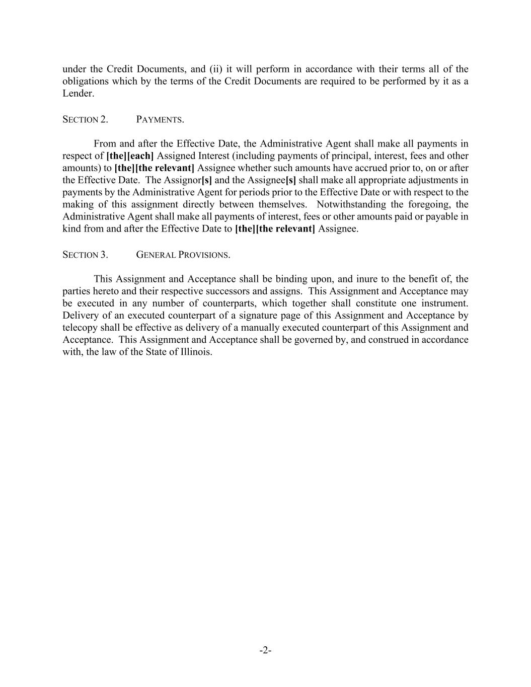 -2- under the Credit Documents, and (ii) it will perform in accordance with their terms all of the obligations which by the terms of the Credit Documents are required to be performed by it as a Lender. SECTION 2. PAYMENTS. From and after the Effective Date, the Administrative Agent shall make all payments in respect of [the][each] Assigned Interest (including payments of principal, interest, fees and other amounts) to [the][the relevant] Assignee whether such amounts have accrued prior to, on or after the Effective Date. The Assignor[s] and the Assignee[s] shall make all appropriate adjustments in payments by the Administrative Agent for periods prior to the Effective Date or with respect to the making of this assignment directly between themselves. Notwithstanding the foregoing, the Administrative Agent shall make all payments of interest, fees or other amounts paid or payable in kind from and after the Effective Date to [the][the relevant] Assignee. SECTION 3. GENERAL PROVISIONS. This Assignment and Acceptance shall be binding upon, and inure to the benefit of, the parties hereto and their respective successors and assigns. This Assignment and Acceptance may be executed in any number of counterparts, which together shall constitute one instrument. Delivery of an executed counterpart of a signature page of this Assignment and Acceptance by telecopy shall be effective as delivery of a manually executed counterpart of this Assignment and Acceptance. This Assignment and Acceptance shall be governed by, and construed in accordance with, the law of the State of Illinois.