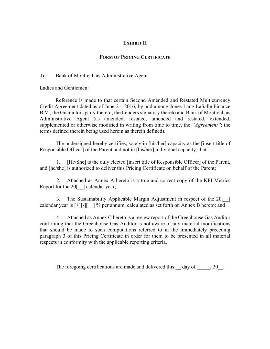 EXHIBIT H FORM OF PRICING CERTIFICATE To: Bank of Montreal, as Administrative Agent Ladies and Gentlemen: Reference is made to that certain Second Amended and Restated Multicurrency Credit Agreement dated as of June 21, 2016, by and among Jones Lang LaSalle Finance B.V., the Guarantors party thereto, the Lenders signatory thereto and Bank of Montreal, as Administrative Agent (as amended, restated, amended and restated, extended, supplemented or otherwise modified in writing from time to time, the “Agreement”; the terms defined therein being used herein as therein defined). The undersigned hereby certifies, solely in [his/her] capacity as the [insert title of Responsible Officer] of the Parent and not in [his/her] individual capacity, that: 1. [He/She] is the duly elected [insert title of Responsible Officer] of the Parent, and [he/she] is authorized to deliver this Pricing Certificate on behalf of the Parent; 2. Attached as Annex A hereto is a true and correct copy of the KPI Metrics Report for the 20[__] calendar year; 3. The Sustainability Applicable Margin Adjustment in respect of the 20[__] calendar year is [+][-][__] % per annum, calculated as set forth on Annex B hereto; and 4. Attached as Annex C hereto is a review report of the Greenhouse Gas Auditor confirming that the Greenhouse Gas Auditor is not aware of any material modifications that should be made to such computations referred to in the immediately preceding paragraph 3 of this Pricing Certificate in order for them to be presented in all material respects in conformity with the applicable reporting criteria. The foregoing certifications are made and delivered this __ day of _____, 20__.