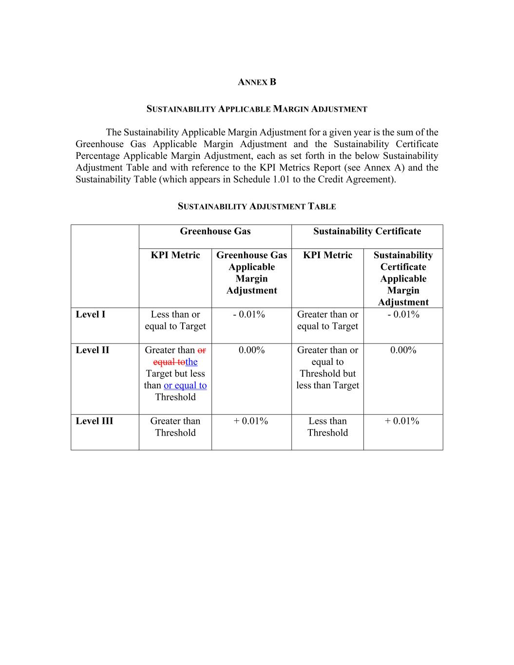 ANNEX B SUSTAINABILITY APPLICABLE MARGIN ADJUSTMENT The Sustainability Applicable Margin Adjustment for a given year is the sum of the Greenhouse Gas Applicable Margin Adjustment and the Sustainability Certificate Percentage Applicable Margin Adjustment, each as set forth in the below Sustainability Adjustment Table and with reference to the KPI Metrics Report (see Annex A) and the Sustainability Table (which appears in Schedule 1.01 to the Credit Agreement). SUSTAINABILITY ADJUSTMENT TABLE Greenhouse Gas Sustainability Certificate KPI Metric Greenhouse Gas Applicable Margin Adjustment KPI Metric Sustainability Certificate Applicable Margin Adjustment Level I Less than or equal to Target - 0.01% Greater than or equal to Target - 0.01% Level II Greater than or equal tothe Target but less than or equal to Threshold 0.00% Greater than or equal to Threshold but less than Target 0.00% Level III Greater than Threshold + 0.01% Less than Threshold + 0.01%