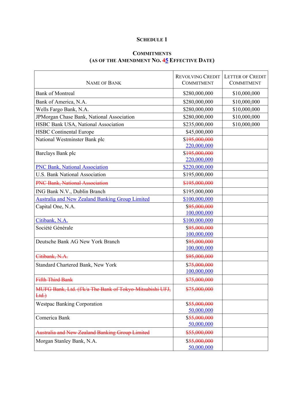SCHEDULE 1 COMMITMENTS (AS OF THE AMENDMENT NO. 45 EFFECTIVE DATE) NAME OF BANK REVOLVING CREDIT COMMITMENT LETTER OF CREDIT COMMITMENT Bank of Montreal $280,000,000 $10,000,000 Bank of America, N.A. $280,000,000 $10,000,000 Wells Fargo Bank, N.A. $280,000,000 $10,000,000 JPMorgan Chase Bank, National Association $280,000,000 $10,000,000 HSBC Bank USA, National Association $235,000,000 $10,000,000 HSBC Continental Europe $45,000,000 National Westminster Bank plc $195,000,000 220,000,000 Barclays Bank plc $195,000,000 220,000,000 PNC Bank, National Association $220,000,000 U.S. Bank National Association $195,000,000 PNC Bank, National Association $195,000,000 ING Bank N.V., Dublin Branch $195,000,000 Australia and New Zealand Banking Group Limited $100,000,000 Capital One, N.A. $95,000,000 100,000,000 Citibank, N.A. $100,000,000 Société Générale $95,000,000 100,000,000 Deutsche Bank AG New York Branch $95,000,000 100,000,000 Citibank, N.A. $95,000,000 Standard Chartered Bank, New York $75,000,000 100,000,000 Fifth Third Bank $75,000,000 MUFG Bank, Ltd. (f/k/a The Bank of Tokyo-Mitsubishi UFJ, Ltd.) $75,000,000 Westpac Banking Corporation $55,000,000 50,000,000 Comerica Bank $55,000,000 50,000,000 Australia and New Zealand Banking Group Limited $55,000,000 Morgan Stanley Bank, N.A. $55,000,000 50,000,000