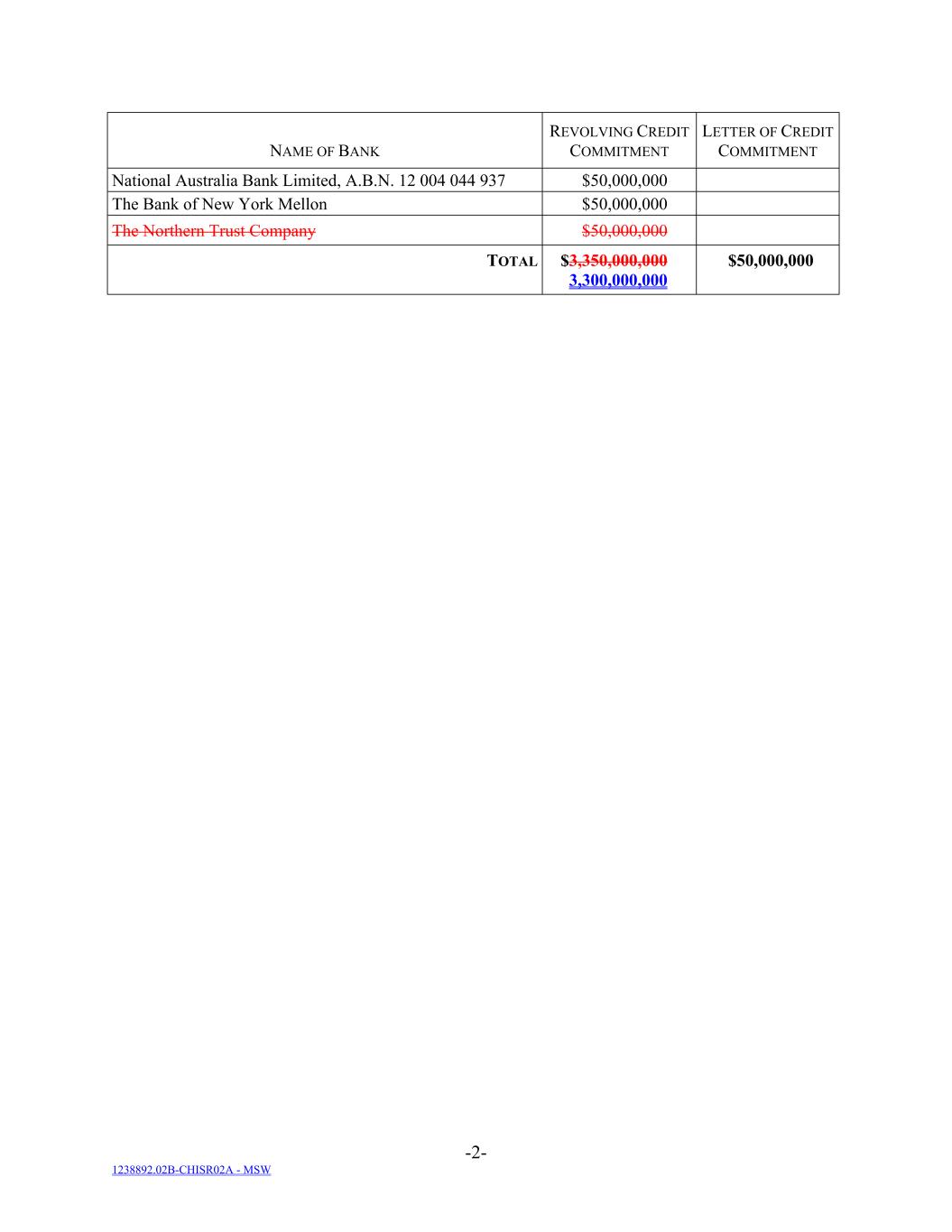 -2- 1238892.02B-CHISR02A - MSW NAME OF BANK REVOLVING CREDIT COMMITMENT LETTER OF CREDIT COMMITMENT National Australia Bank Limited, A.B.N. 12 004 044 937 $50,000,000 The Bank of New York Mellon $50,000,000 The Northern Trust Company $50,000,000 TOTAL $3,350,000,000 3,300,000,000 $50,000,000