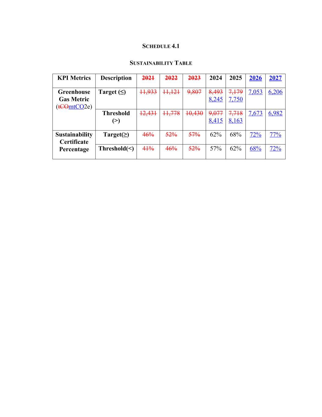 SCHEDULE 4.1 SUSTAINABILITY TABLE KPI Metrics Description 2021 2022 2023 2024 2025 2026 2027 Target (≤) 11,933 11,121 9,807 8,493 8,245 7,179 7,750 7,053 6,206Greenhouse Gas Metric (tCOmtCO2e) Threshold (>) 12,431 11,778 10,430 9,077 8,415 7,718 8,163 7,673 6,982 Target(≥) 46% 52% 57% 62% 68% 72% 77%Sustainability Certificate Percentage Threshold(<) 41% 46% 52% 57% 62% 68% 72%