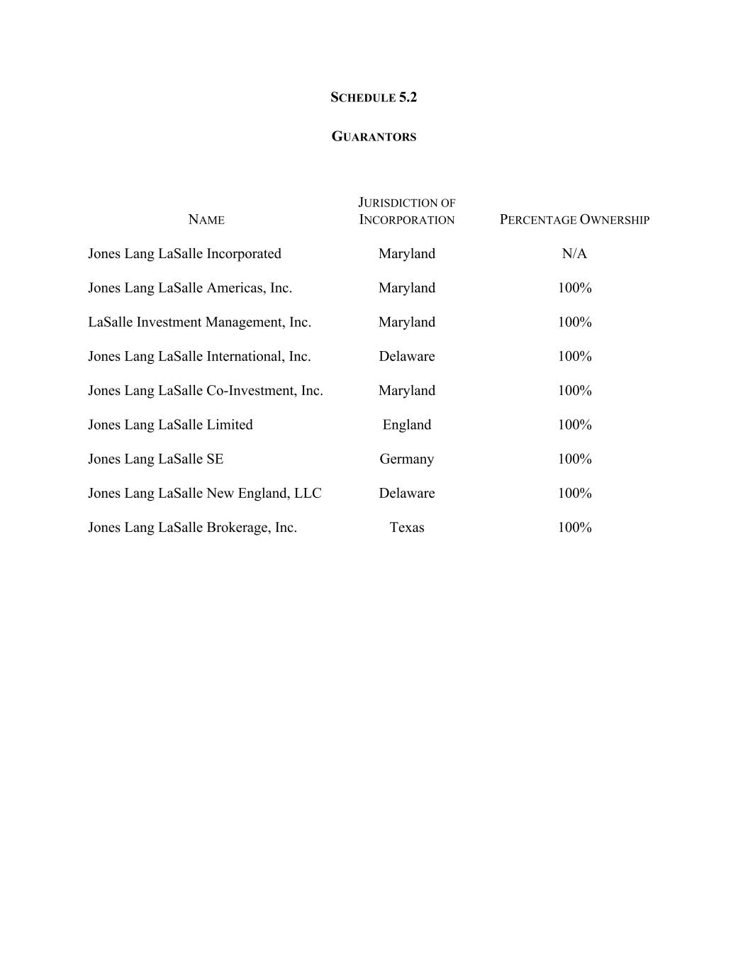 SCHEDULE 5.2 GUARANTORS NAME JURISDICTION OF INCORPORATION PERCENTAGE OWNERSHIP Jones Lang LaSalle Incorporated Maryland N/A Jones Lang LaSalle Americas, Inc. Maryland 100% LaSalle Investment Management, Inc. Maryland 100% Jones Lang LaSalle International, Inc. Delaware 100% Jones Lang LaSalle Co-Investment, Inc. Maryland 100% Jones Lang LaSalle Limited England 100% Jones Lang LaSalle SE Germany 100% Jones Lang LaSalle New England, LLC Delaware 100% Jones Lang LaSalle Brokerage, Inc. Texas 100%