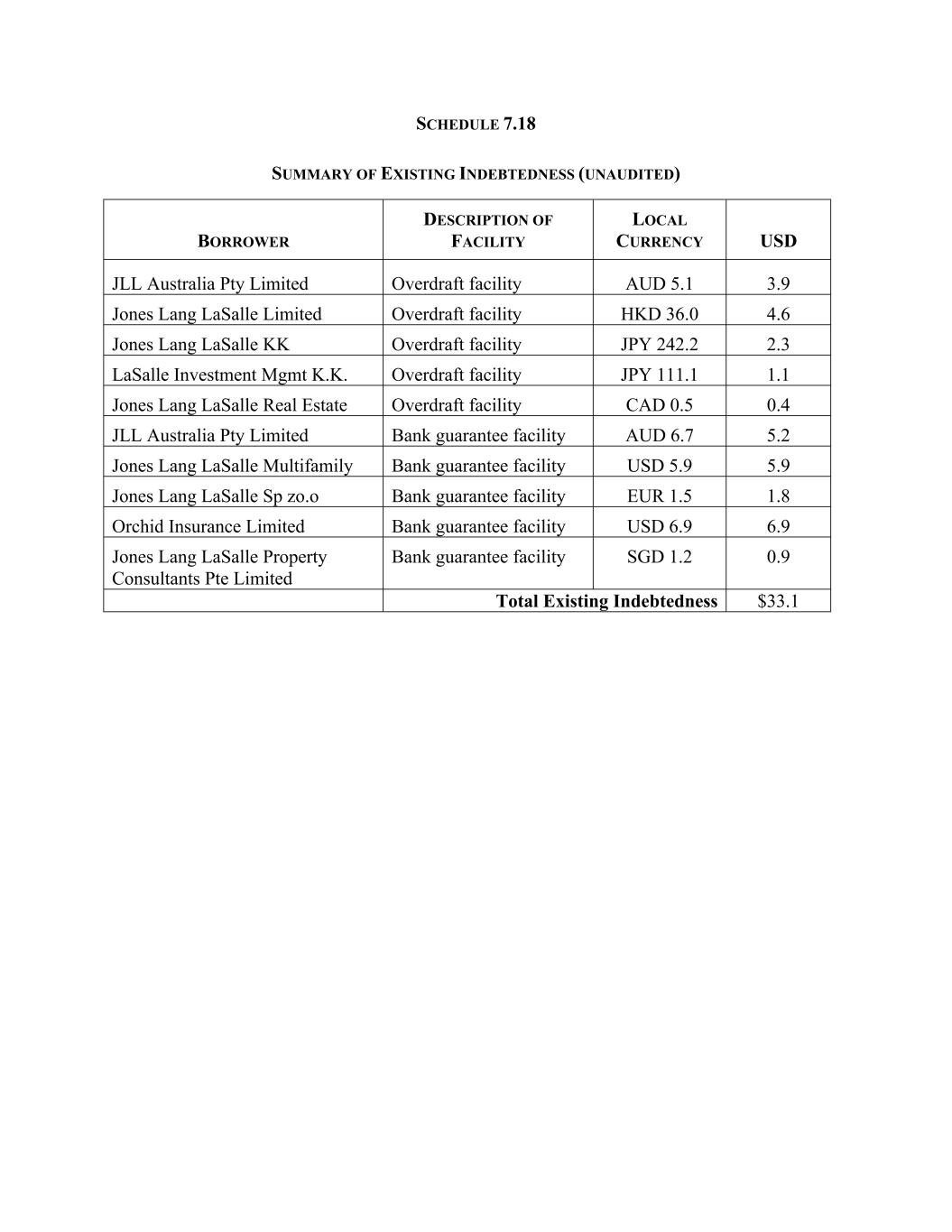 SCHEDULE 7.18 SUMMARY OF EXISTING INDEBTEDNESS (UNAUDITED) BORROWER DESCRIPTION OF FACILITY LOCAL CURRENCY USD JLL Australia Pty Limited Overdraft facility AUD 5.1 3.9 Jones Lang LaSalle Limited Overdraft facility HKD 36.0 4.6 Jones Lang LaSalle KK Overdraft facility JPY 242.2 2.3 LaSalle Investment Mgmt K.K. Overdraft facility JPY 111.1 1.1 Jones Lang LaSalle Real Estate Overdraft facility CAD 0.5 0.4 JLL Australia Pty Limited Bank guarantee facility AUD 6.7 5.2 Jones Lang LaSalle Multifamily Bank guarantee facility USD 5.9 5.9 Jones Lang LaSalle Sp zo.o Bank guarantee facility EUR 1.5 1.8 Orchid Insurance Limited Bank guarantee facility USD 6.9 6.9 Jones Lang LaSalle Property Consultants Pte Limited Bank guarantee facility SGD 1.2 0.9 Total Existing Indebtedness $33.1