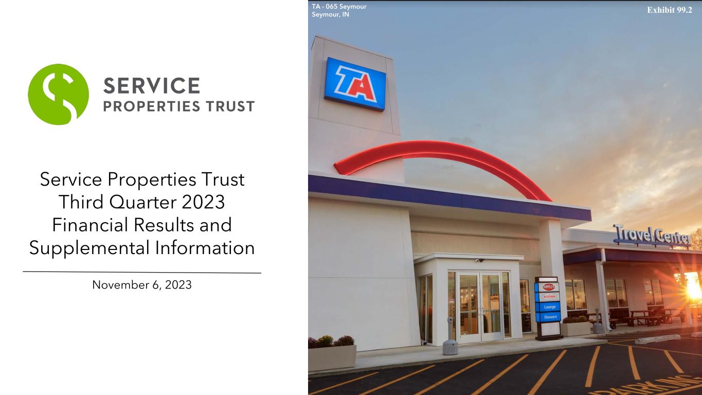 2RETURN TO TABLE OF CONTENTS Table of Contents QUARTERLY RESULTS Service Properties Trust Announces Third Quarter 2023 Financial Results ................................................................................................................................................ 4 Third Quarter 2023 Highlights ............................................................................................................................................................................................................................. 5 Third Quarter 2023 Results ................................................................................................................................................................................................................................... 6 FINANCIALS Key Financial Data .................................................................................................................................................................................................................................................. 8 Condensed Consolidated Statements of Income (Loss) ................................................................................................................................................................................. 9 Condensed Consolidated Balance Sheets ........................................................................................................................................................................................................ 10 Debt Summary ......................................................................................................................................................................................................................................................... 11 Debt Maturity Schedule ......................................................................................................................................................................................................................................... 12 Leverage Ratios, Coverage Ratios and Public Debt Covenants .................................................................................................................................................................... 13 Capital Expenditures and Restricted Cash Activity .......................................................................................................................................................................................... 14 Property Acquisitions and Dispositions Information Since January 1, 2023 ............................................................................................................................................... 15 PORTFOLIO INFORMATION Portfolio Summary .................................................................................................................................................................................................................................................. 17 Consolidated Portfolio Diversification by Industry ........................................................................................................................................................................................... 18 Consolidated Portfolio by Geographical Diversification ................................................................................................................................................................................ 19 Hotel Portfolio by Brand ........................................................................................................................................................................................................................................ 20 Hotel Operating Statistics by Service Level - Comparable Hotels - three months ended September 30, 2023 ................................................................................. 21 Hotel Operating Statistics by Service Level - Comparable Hotels - nine months ended September 30, 2023 ................................................................................... 22 Hotel Operating Statistics by Service Level - All Hotels - three months ended September 30, 2023 ................................................................................................... 23 Hotel Operating Statistics by Service Level - All Hotels - nine months ended September 30, 2023 ..................................................................................................... 24 Net Lease Portfolio by Brand ................................................................................................................................................................................................................................ 25 Net Lease Portfolio by Industry ............................................................................................................................................................................................................................ 26 Net Lease Portfolio by Tenant (Top 10) .............................................................................................................................................................................................................. 27 Net Lease Portfolio - Expiration Schedule ......................................................................................................................................................................................................... 28 Net Lease Portfolio - Occupancy Summary ....................................................................................................................................................................................................... 29 APPENDIX Company Profile and Research Coverage .............................................................................................................................................