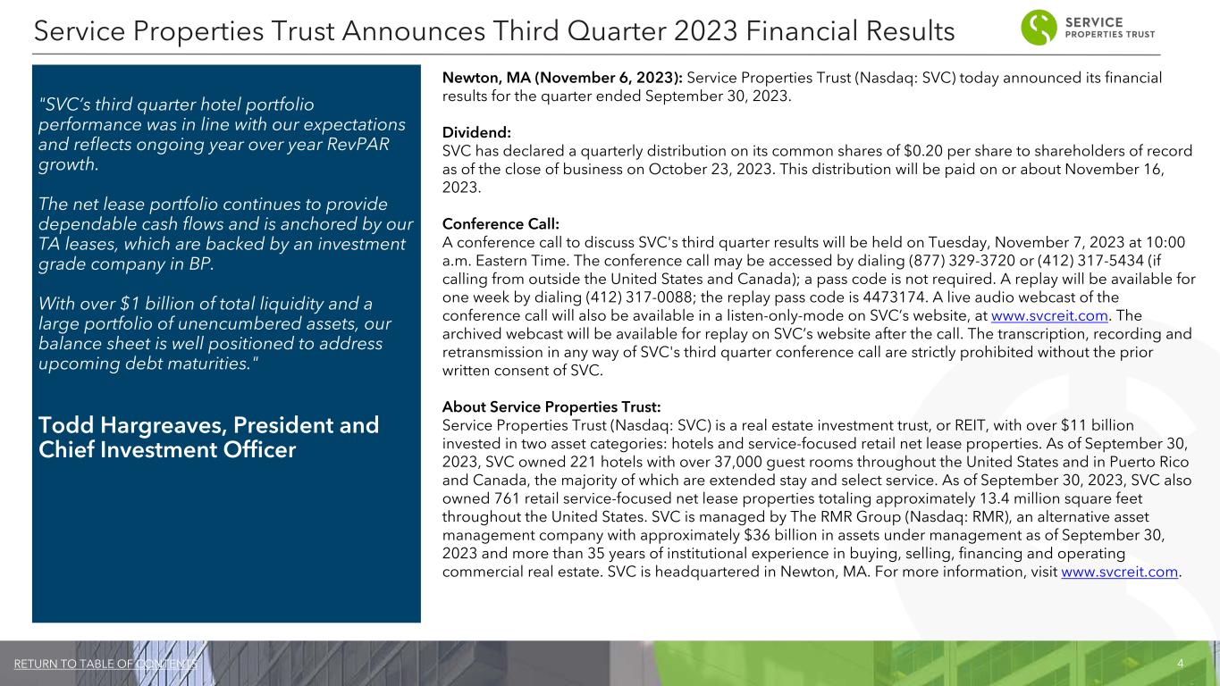 4RETURN TO TABLE OF CONTENTS Newton, MA (November 6, 2023): Service Properties Trust (Nasdaq: SVC) today announced its financial results for the quarter ended September 30, 2023. Dividend: SVC has declared a quarterly distribution on its common shares of $0.20 per share to shareholders of record as of the close of business on October 23, 2023. This distribution will be paid on or about November 16, 2023. Conference Call: A conference call to discuss SVC's third quarter results will be held on Tuesday, November 7, 2023 at 10:00 a.m. Eastern Time. The conference call may be accessed by dialing (877) 329-3720 or (412) 317-5434 (if calling from outside the United States and Canada); a pass code is not required. A replay will be available for one week by dialing (412) 317-0088; the replay pass code is 4473174. A live audio webcast of the conference call will also be available in a listen-only-mode on SVC’s website, at www.svcreit.com. The archived webcast will be available for replay on SVC’s website after the call. The transcription, recording and retransmission in any way of SVC's third quarter conference call are strictly prohibited without the prior written consent of SVC. About Service Properties Trust: Service Properties Trust (Nasdaq: SVC) is a real estate investment trust, or REIT, with over $11 billion invested in two asset categories: hotels and service-focused retail net lease properties. As of September 30, 2023, SVC owned 221 hotels with over 37,000 guest rooms throughout the United States and in Puerto Rico and Canada, the majority of which are extended stay and select service. As of September 30, 2023, SVC also owned 761 retail service-focused net lease properties totaling approximately 13.4 million square feet throughout the United States. SVC is managed by The RMR Group (Nasdaq: RMR), an alternative asset management company with approximately $36 billion in assets under management as of September 30, 2023 and more than 35 years of institutional experience in buying, selling, financing and operating commercial real estate. SVC is headquartered in Newton, MA. For more information, visit www.svcreit.com. Service Properties Trust Announces Third Quarter 2023 Financial Results "SVC’s third quarter hotel portfolio performance was in line with our expectations and reflects ongoing year over year RevPAR growth. The net lease portfolio continues to provide dependable cash flows and is anchored by our TA leases, which are backed by an investment grade company in BP. With over $1 billion of total liquidity and a large portfolio of unencumbered assets, our balance sheet is well positioned to address upcoming debt maturities." Todd Hargreaves, President and Chief Investment Officer