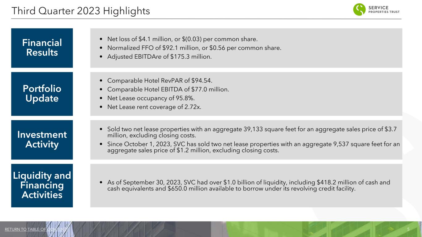 5RETURN TO TABLE OF CONTENTS Third Quarter 2023 Highlights Financial Results • Net loss of $4.1 million, or $(0.03) per common share. • Normalized FFO of $92.1 million, or $0.56 per common share. • Adjusted EBITDAre of $175.3 million. Portfolio Update • Comparable Hotel RevPAR of $94.54. • Comparable Hotel EBITDA of $77.0 million. • Net Lease occupancy of 95.8%. • Net Lease rent coverage of 2.72x. Investment Activity • Sold two net lease properties with an aggregate 39,133 square feet for an aggregate sales price of $3.7 million, excluding closing costs. • Since October 1, 2023, SVC has sold two net lease properties with an aggregate 9,537 square feet for an aggregate sales price of $1.2 million, excluding closing costs. Liquidity and Financing Activities • As of September 30, 2023, SVC had over $1.0 billion of liquidity, including $418.2 million of cash and cash equivalents and $650.0 million available to borrow under its revolving credit facility.