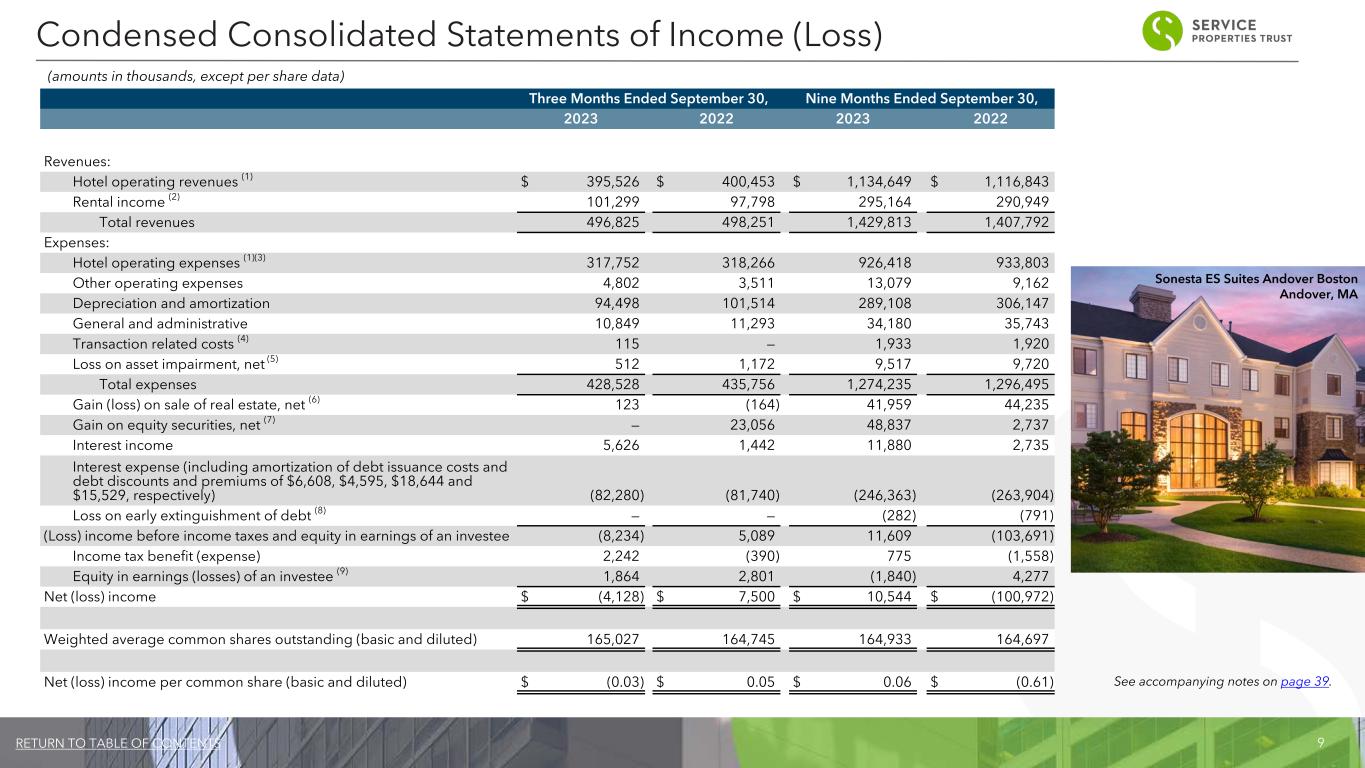 9RETURN TO TABLE OF CONTENTS Three Months Ended September 30, Nine Months Ended September 30, 2023 2022 2023 2022 Revenues: Hotel operating revenues (1) $ 395,526 $ 400,453 $ 1,134,649 $ 1,116,843 Rental income (2) 101,299 97,798 295,164 290,949 Total revenues 496,825 498,251 1,429,813 1,407,792 Expenses: Hotel operating expenses (1)(3) 317,752 318,266 926,418 933,803 Other operating expenses 4,802 3,511 13,079 9,162 Depreciation and amortization 94,498 101,514 289,108 306,147 General and administrative 10,849 11,293 34,180 35,743 Transaction related costs (4) 115 — 1,933 1,920 Loss on asset impairment, net (5) 512 1,172 9,517 9,720 Total expenses 428,528 435,756 1,274,235 1,296,495 Gain (loss) on sale of real estate, net (6) 123 (164) 41,959 44,235 Gain on equity securities, net (7) — 23,056 48,837 2,737 Interest income 5,626 1,442 11,880 2,735 Interest expense (including amortization of debt issuance costs and debt discounts and premiums of $6,608, $4,595, $18,644 and $15,529, respectively) (82,280) (81,740) (246,363) (263,904) Loss on early extinguishment of debt (8) — — (282) (791) (Loss) income before income taxes and equity in earnings of an investee (8,234) 5,089 11,609 (103,691) Income tax benefit (expense) 2,242 (390) 775 (1,558) Equity in earnings (losses) of an investee (9) 1,864 2,801 (1,840) 4,277 Net (loss) income $ (4,128) $ 7,500 $ 10,544 $ (100,972) Weighted average common shares outstanding (basic and diluted) 165,027 164,745 164,933 164,697 Net (loss) income per common share (basic and diluted) $ (0.03) $ 0.05 $ 0.06 $ (0.61) (amounts in thousands, except per share data) Condensed Consolidated Statements of Income (Loss) See accompanying notes on page 39. Sonesta ES Suites Andover Boston Andover, MA