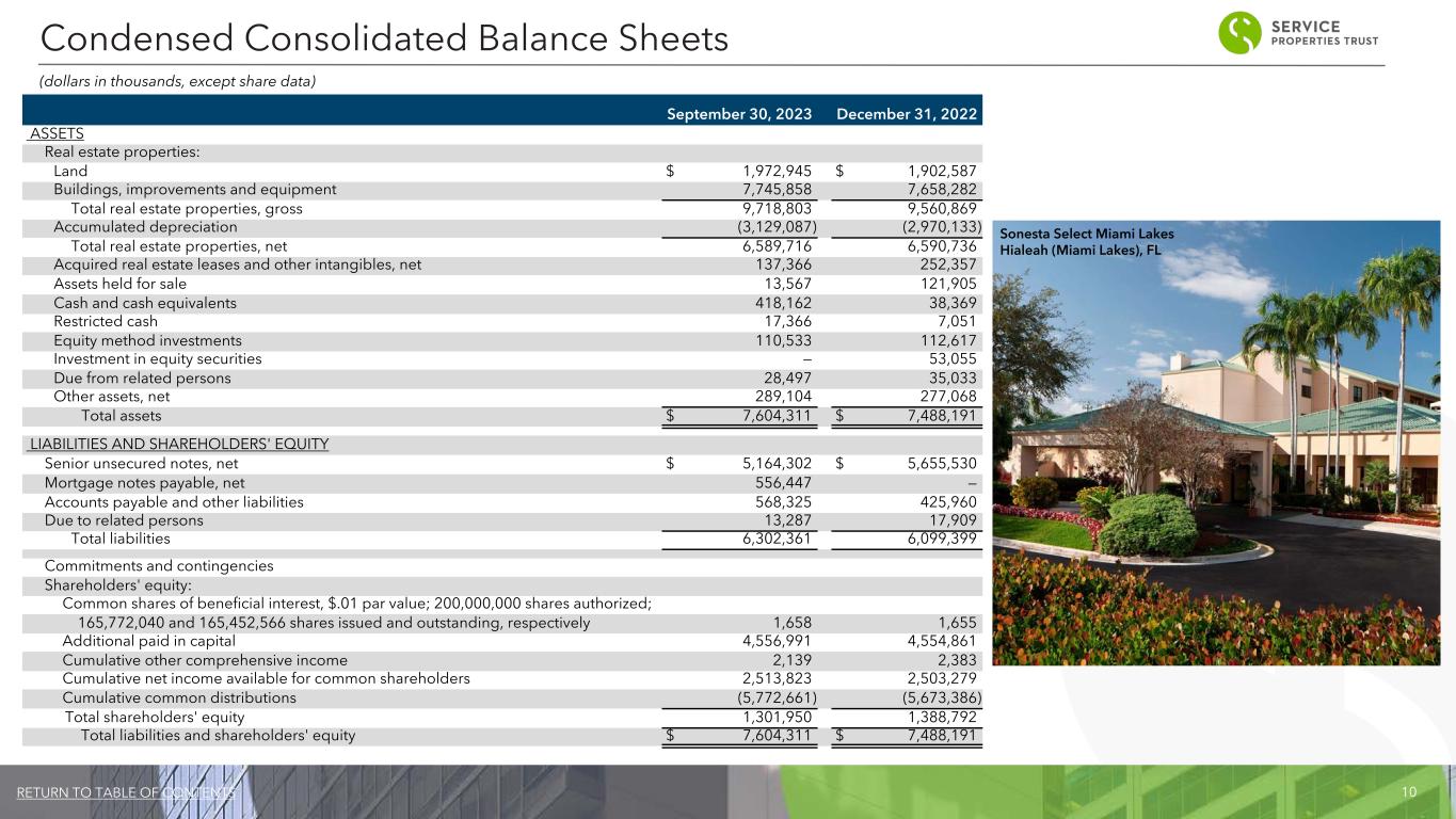10RETURN TO TABLE OF CONTENTS September 30, 2023 December 31, 2022 ASSETS Real estate properties: Land $ 1,972,945 $ 1,902,587 Buildings, improvements and equipment 7,745,858 7,658,282 Total real estate properties, gross 9,718,803 9,560,869 Accumulated depreciation (3,129,087) (2,970,133) Total real estate properties, net 6,589,716 6,590,736 Acquired real estate leases and other intangibles, net 137,366 252,357 Assets held for sale 13,567 121,905 Cash and cash equivalents 418,162 38,369 Restricted cash 17,366 7,051 Equity method investments 110,533 112,617 Investment in equity securities — 53,055 Due from related persons 28,497 35,033 Other assets, net 289,104 277,068 Total assets $ 7,604,311 $ 7,488,191 LIABILITIES AND SHAREHOLDERS' EQUITY Senior unsecured notes, net $ 5,164,302 $ 5,655,530 Mortgage notes payable, net 556,447 — Accounts payable and other liabilities 568,325 425,960 Due to related persons 13,287 17,909 Total liabilities 6,302,361 6,099,399 Commitments and contingencies Shareholders' equity: Common shares of beneficial interest, $.01 par value; 200,000,000 shares authorized; 165,772,040 and 165,452,566 shares issued and outstanding, respectively 1,658 1,655 Additional paid in capital 4,556,991 4,554,861 Cumulative other comprehensive income 2,139 2,383 Cumulative net income available for common shareholders 2,513,823 2,503,279 Cumulative common distributions (5,772,661) (5,673,386) Total shareholders' equity 1,301,950 1,388,792 Total liabilities and shareholders' equity $ 7,604,311 $ 7,488,191 Condensed Consolidated Balance Sheets (dollars in thousands, except share data) Sonesta Select Miami Lakes Hialeah (Miami Lakes), FL