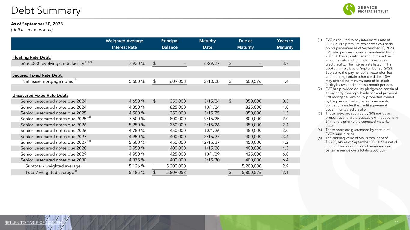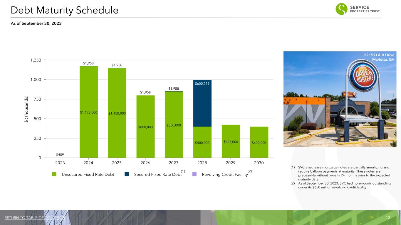 11RETURN TO TABLE OF CONTENTS (1) SVC is required to pay interest at a rate of SOFR plus a premium, which was 250 basis points per annum as of September 30, 2023. SVC also pays an unused commitment fee of 20 to 30 basis points per annum based on amounts outstanding under its revolving credit facility. The interest rate listed in this debt summary is as of September 30, 2023. Subject to the payment of an extension fee and meeting certain other conditions, SVC may extend the maturity date of its credit facility by two additional six month periods. (2) SVC has provided equity pledges on certain of its property owning subsidiaries and provided first mortgage liens on 69 properties owned by the pledged subsidiaries to secure its obligations under the credit agreement governing its credit facility. (3) These notes are secured by 308 net lease properties and are prepayable without penalty 24 months prior to the expected maturity date. (4) These notes are guaranteed by certain of SVC's subsidiaries. (5) The carrying value of SVC's total debt of $5,720,749 as of September 30, 2023 is net of unamortized discounts and premiums and certain issuance costs totaling $88,309. Weighted Average Principal Maturity Due at Years to Interest Rate Balance Date Maturity Maturity Floating Rate Debt: $650,000 revolving credit facility (1)(2) 7.930 % $ — 6/29/27 $ — 3.7 Secured Fixed Rate Debt: Net lease mortgage notes (3) 5.600 % $ 609,058 2/10/28 $ 600,576 4.4 Unsecured Fixed Rate Debt: Senior unsecured notes due 2024 4.650 % $ 350,000 3/15/24 $ 350,000 0.5 Senior unsecured notes due 2024 4.350 % 825,000 10/1/24 825,000 1.0 Senior unsecured notes due 2025 4.500 % 350,000 3/15/25 350,000 1.5 Senior unsecured notes due 2025 (4) 7.500 % 800,000 9/15/25 800,000 2.0 Senior unsecured notes due 2026 5.250 % 350,000 2/15/26 350,000 2.4 Senior unsecured notes due 2026 4.750 % 450,000 10/1/26 450,000 3.0 Senior unsecured notes due 2027 4.950 % 400,000 2/15/27 400,000 3.4 Senior unsecured notes due 2027 (4) 5.500 % 450,000 12/15/27 450,000 4.2 Senior unsecured notes due 2028 3.950 % 400,000 1/15/28 400,000 4.3 Senior unsecured notes due 2029 4.950 % 425,000 10/1/29 425,000 6.0 Senior unsecured notes due 2030 4.375 % 400,000 2/15/30 400,000 6.4 Subtotal / weighted average 5.126 % 5,200,000 5,200,000 2.9 Total / weighted average (5) 5.185 % $ 5,809,058 $ 5,800,576 3.1 Debt Summary As of September 30, 2023 (dollars in thousands)